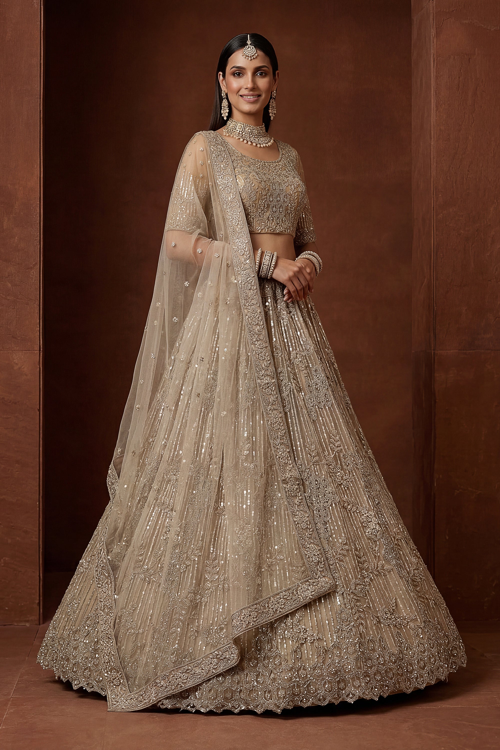 Embroidered Net Beige Lehenga Choli For Sangeet Function