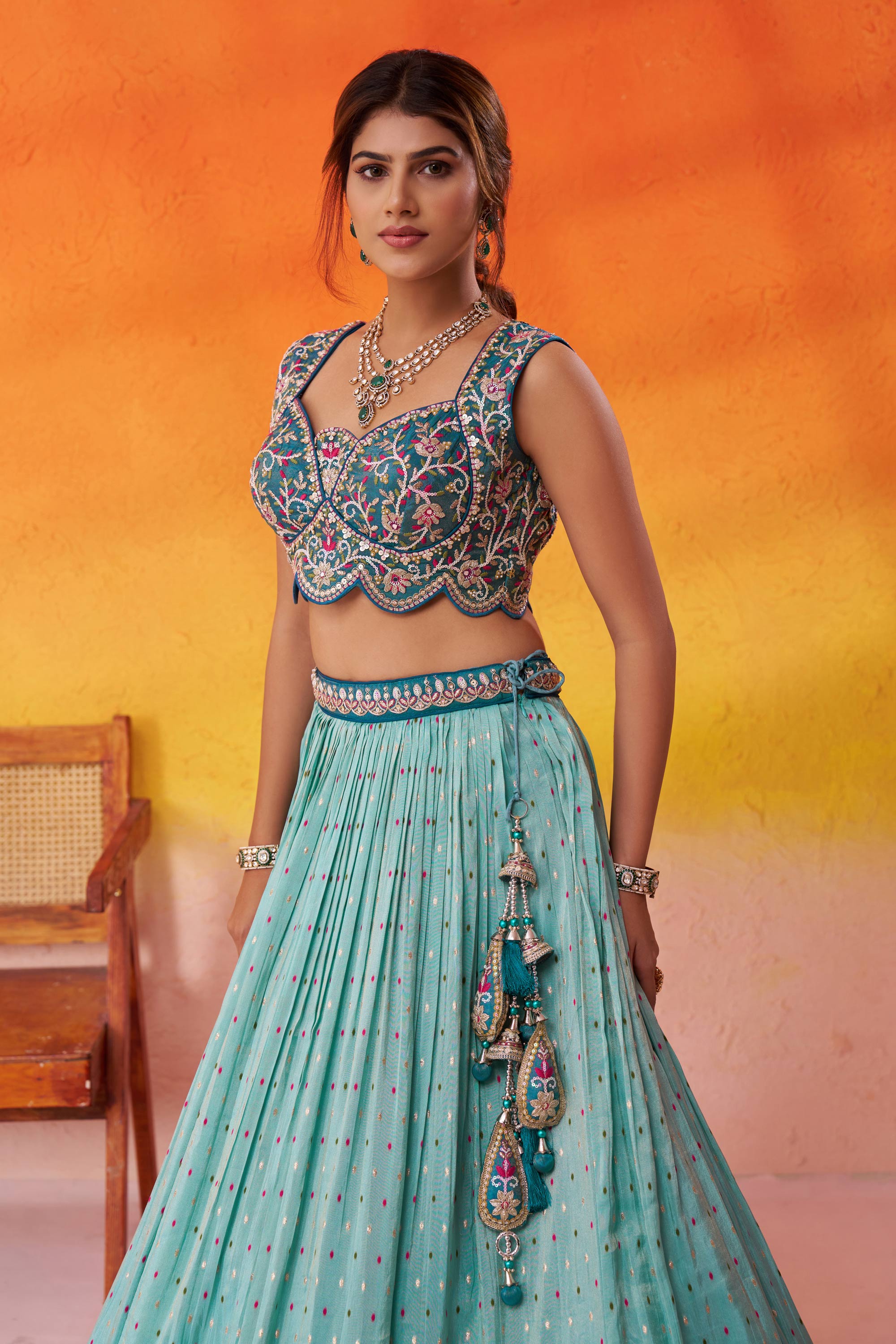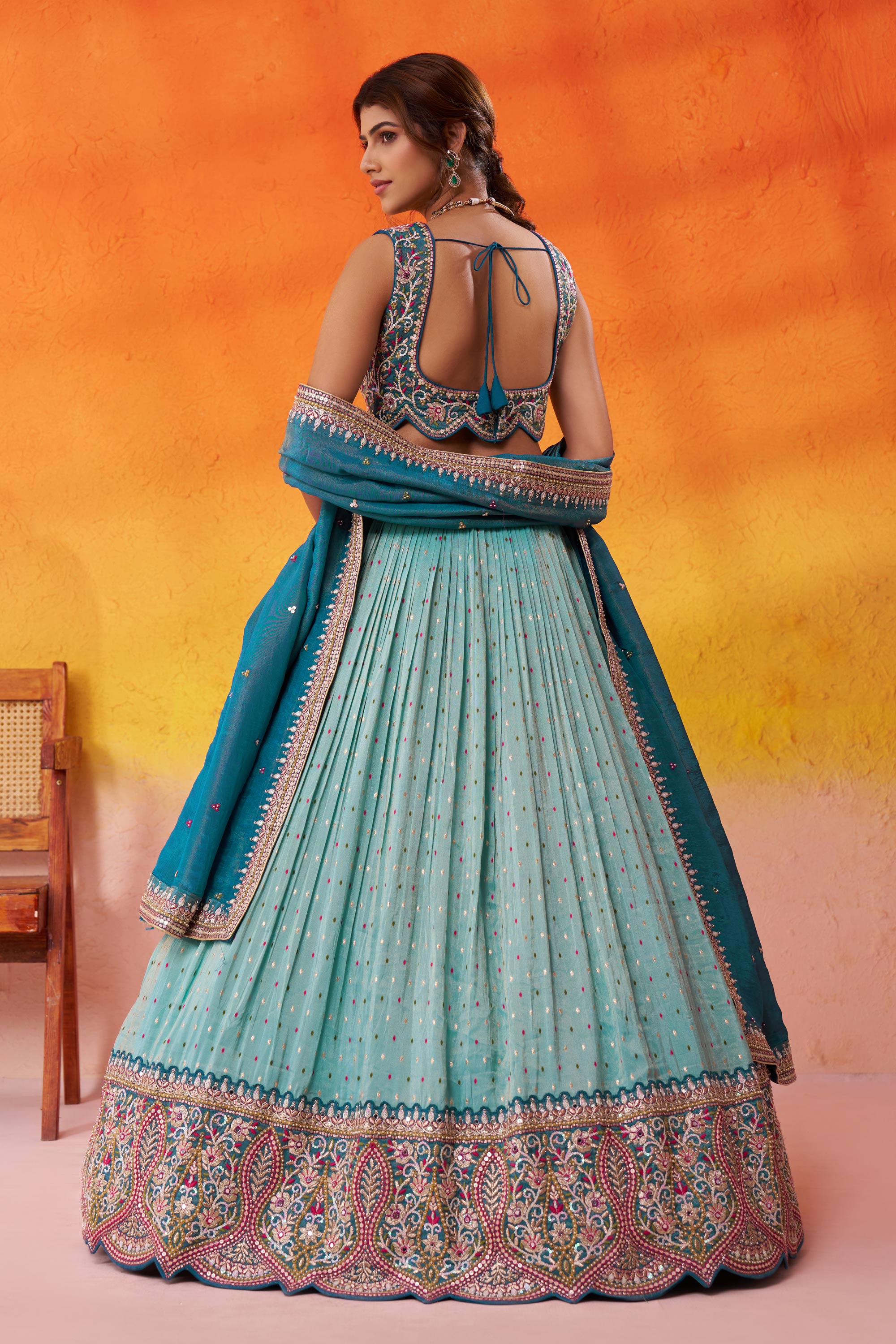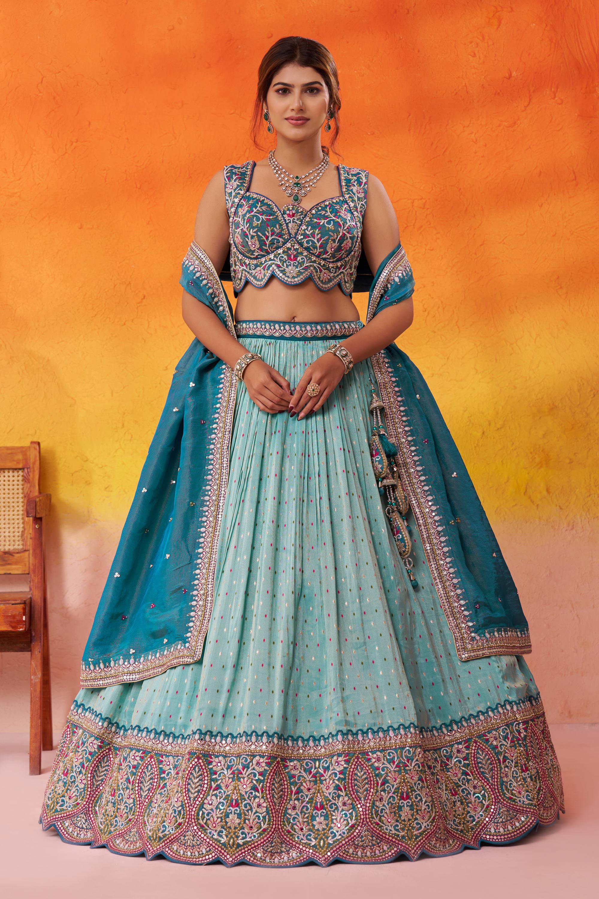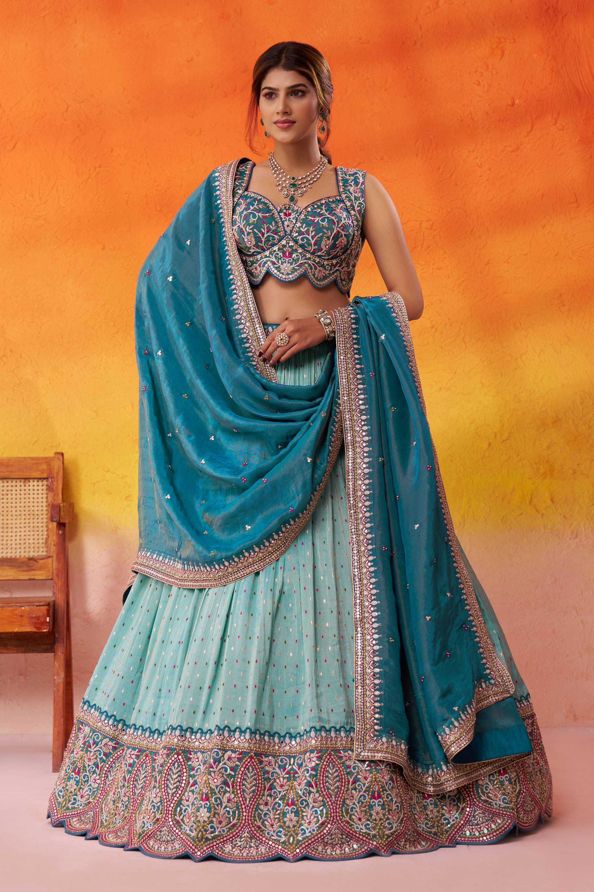 Cyan Tissue Embroidered Wedding Wear Lehenga Choli