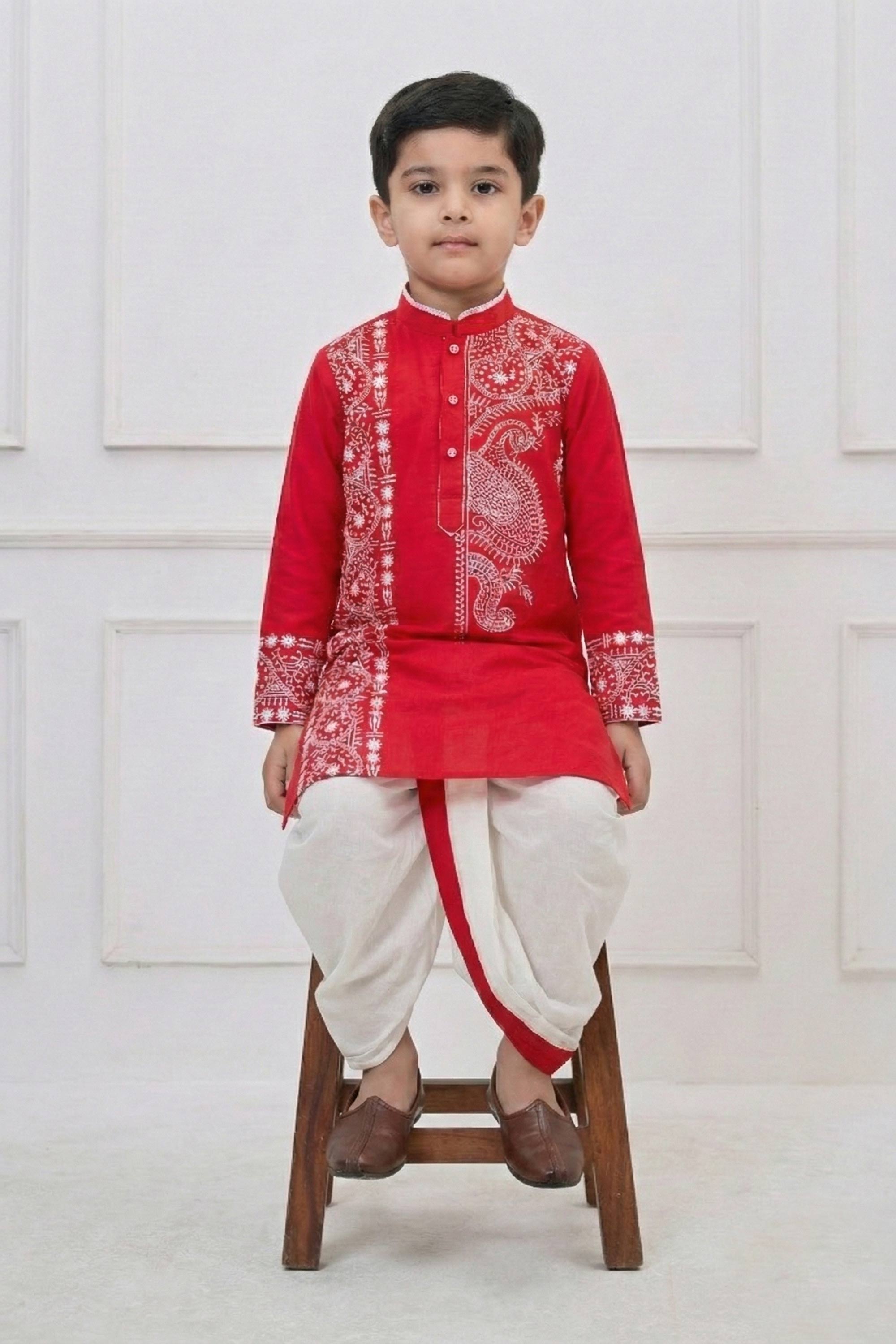 Viscose Embroidered Red Festive Wear Readymade Kurta With Dhoti For Boys