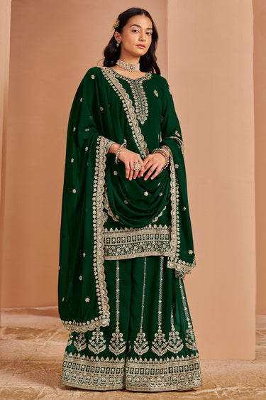 Embroidered Georgette Fabric Palazzo Suit In Dark Green Color
