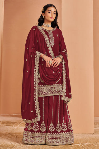 Georgette Fabric Embroidered Function Wear Palazzo Style Dress In Maroon Color