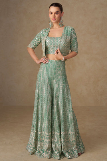 Georgette Sea Green Indo Western Readymade Palazzo With Short Top And Jacket