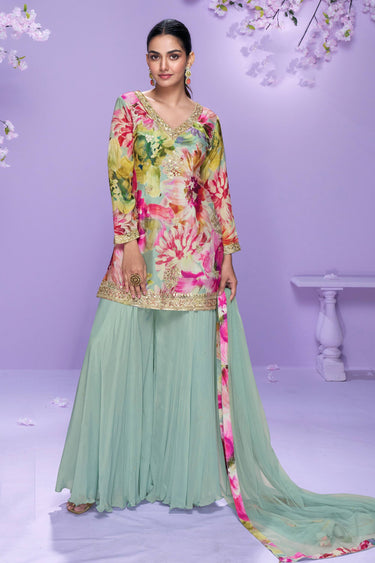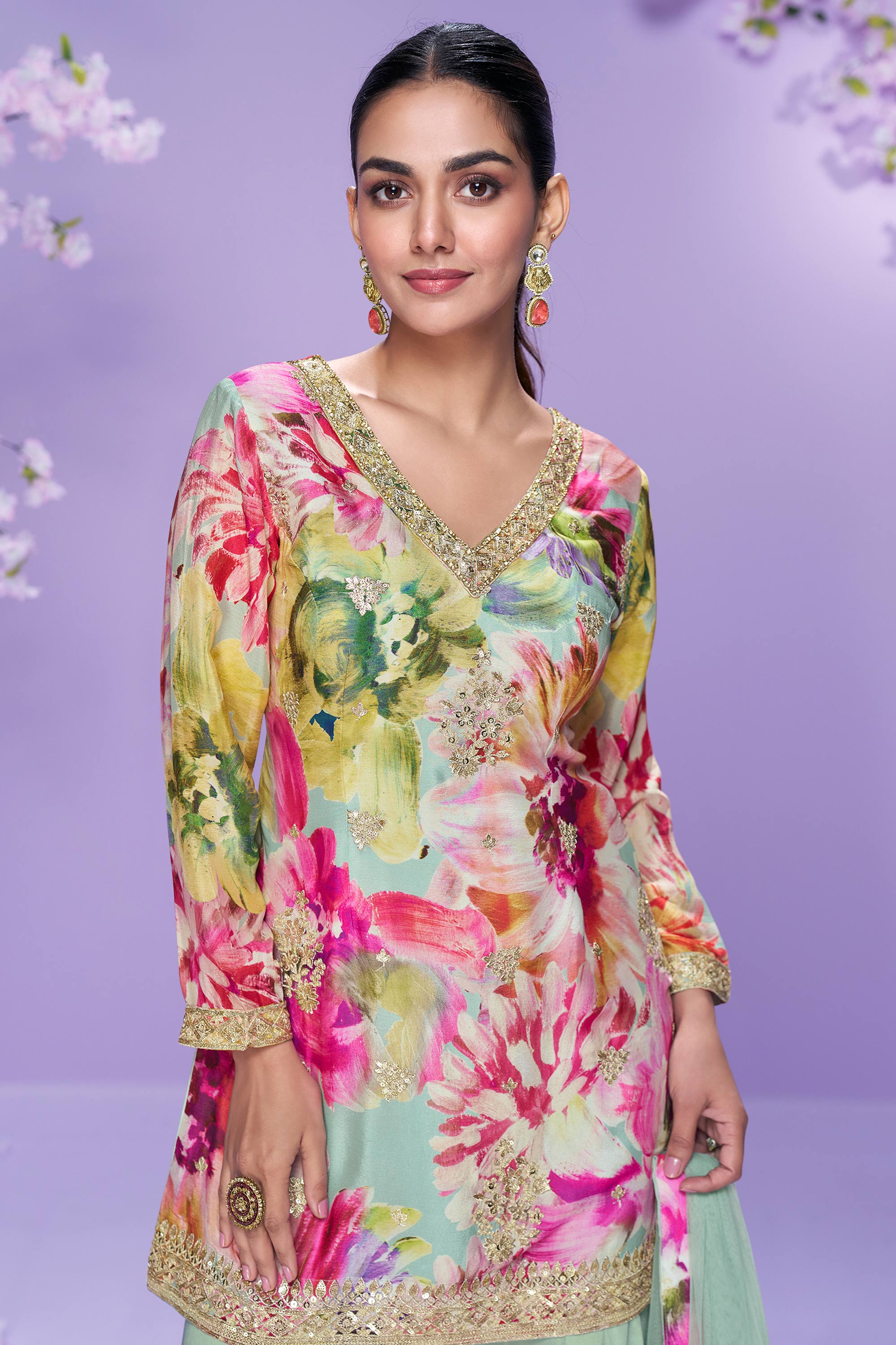 Chinon Digital Printed Multi Color Festive Wear Readymade Palazzo Suit