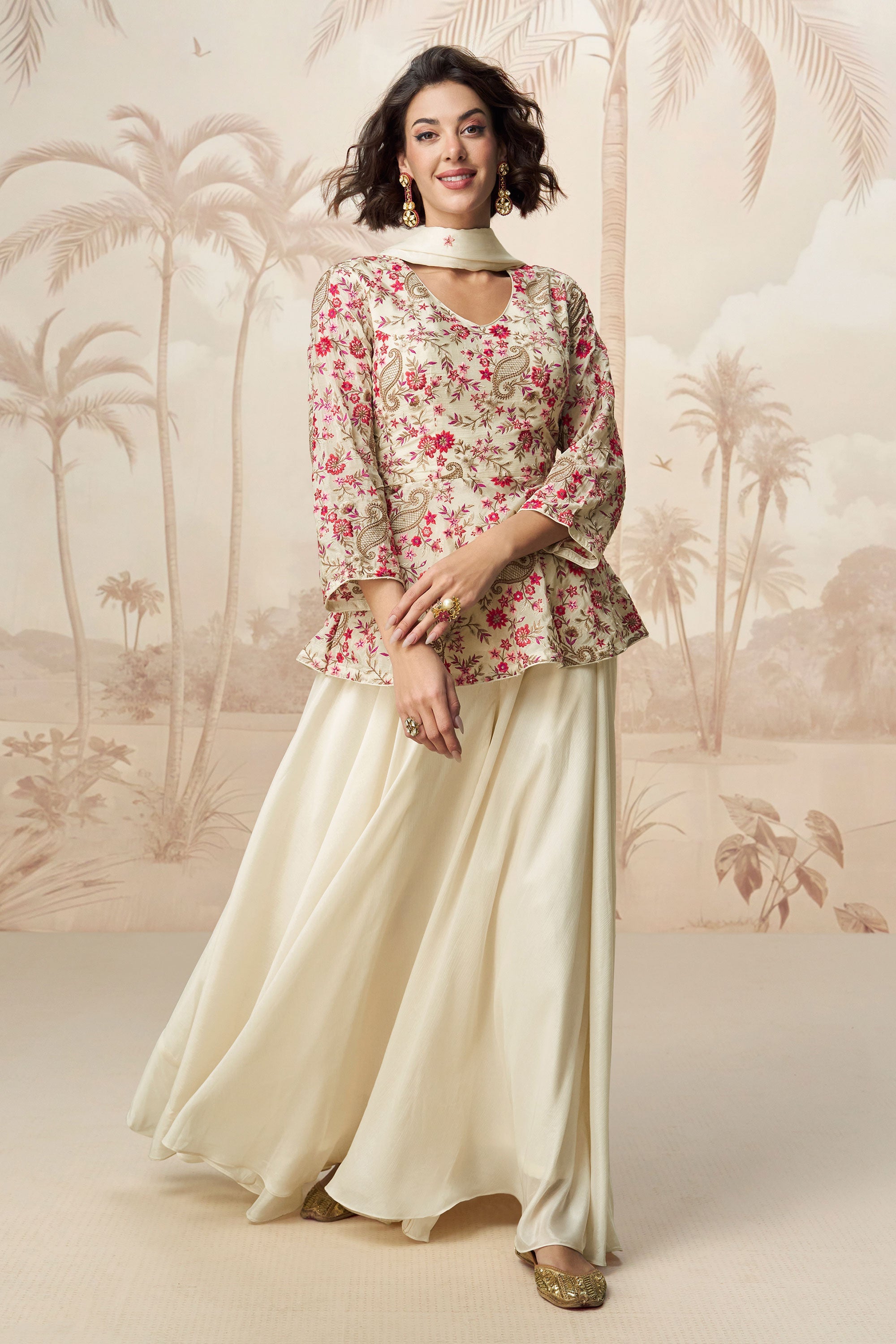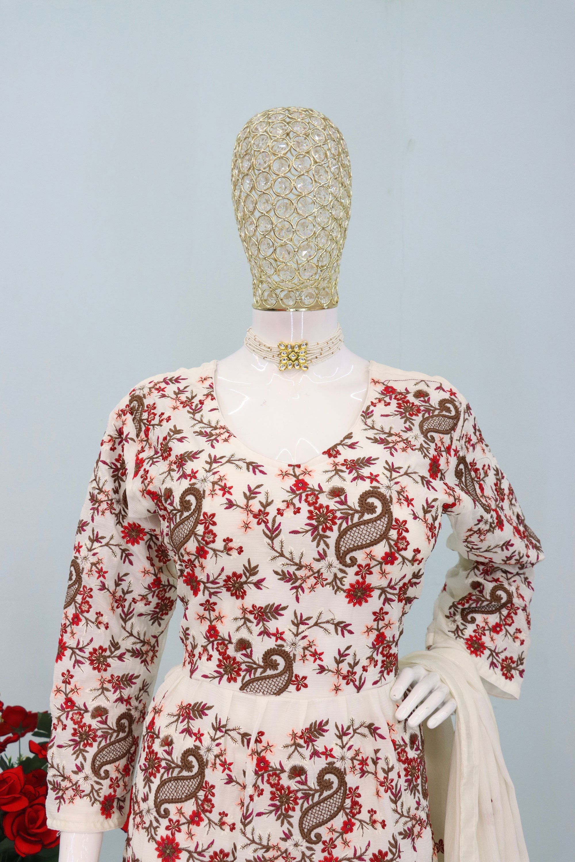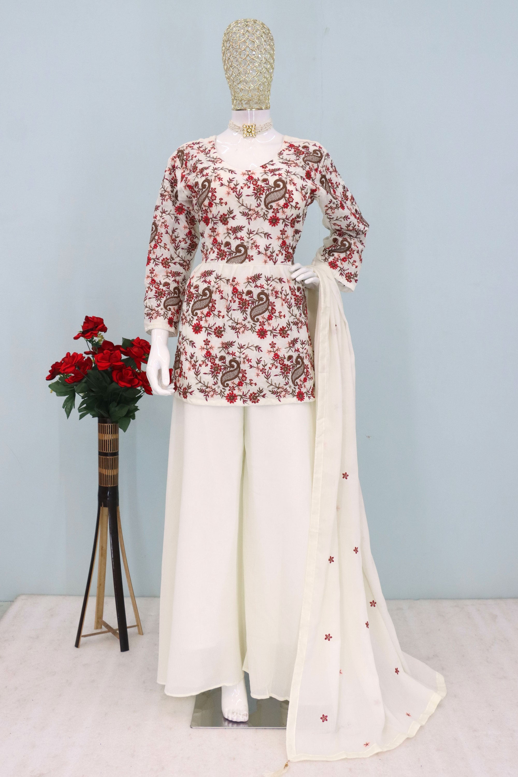 Designer Off White Chinon Readymade Palazzo Suit With Embroidery Work