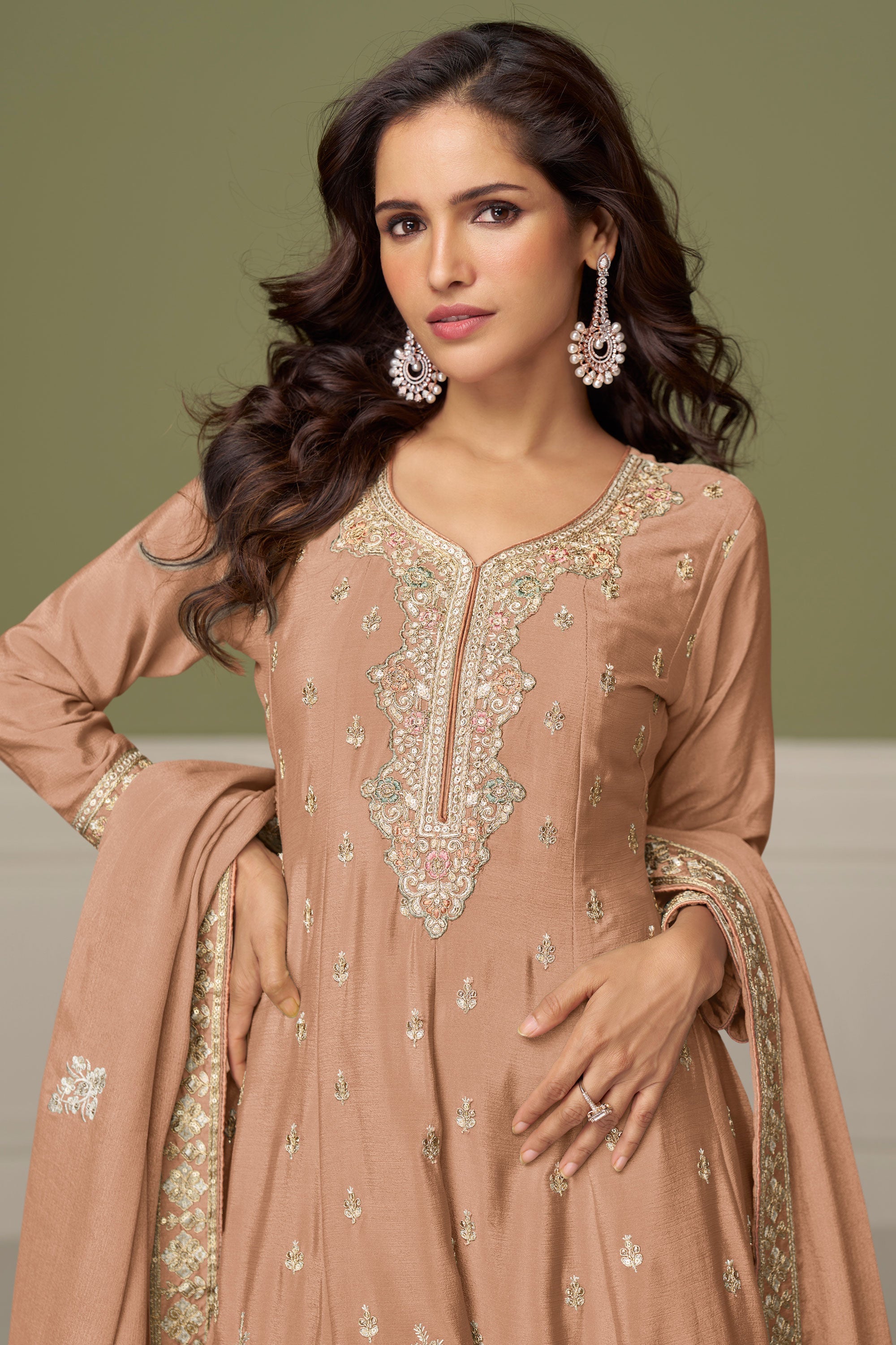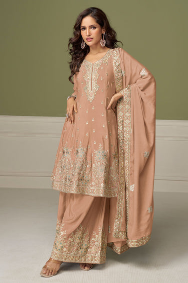 Make a statement with this exquisite Chinon embroidered readymade Sharara-style salwar kameez. This elegant outfit blends tradition and modernity effortlessly, featuring delicate embroidery on soft, high-quality Chinon fabric that feels comfortable on your skin. The ready-to-wear design ensures convenience, while the flowing sharara pants add a fashionable flair perfect for weddings, festivals, and special occasions. Designed for both comfort and sophistication, it is suitable for women looking to showcase their ethnic charm without compromising on ease of wear. Style it with your favorite accessories to complete your festive or formal look.