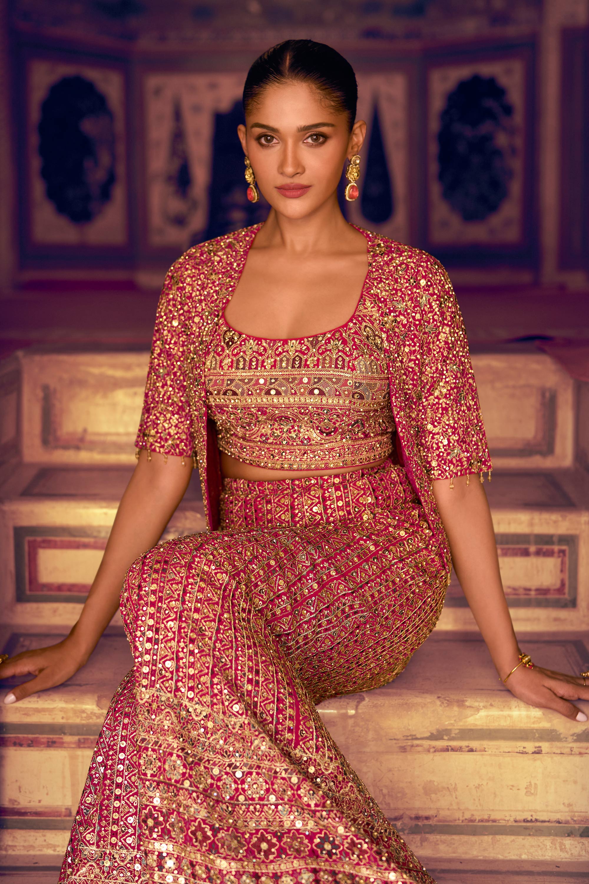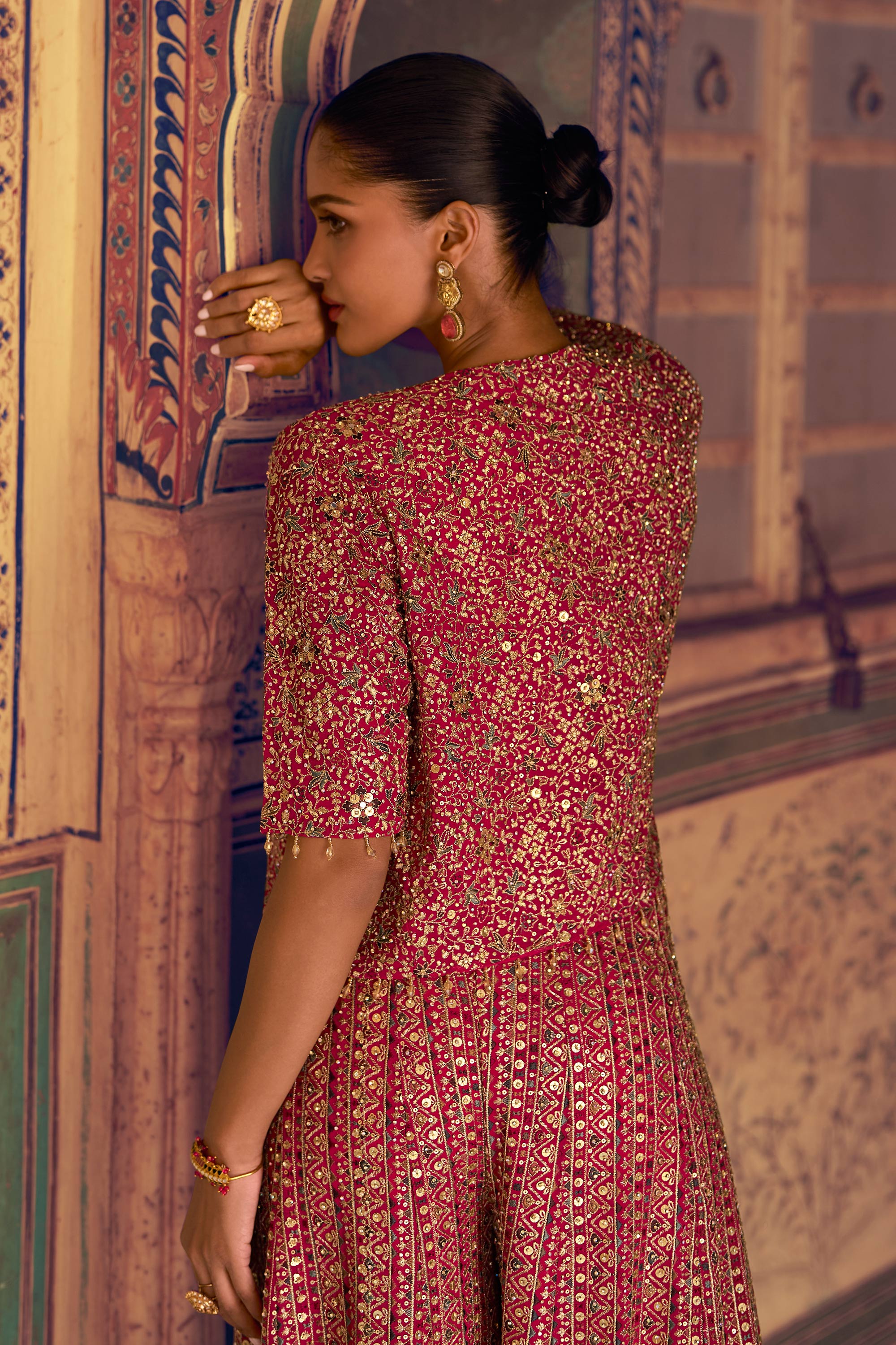 Embroidered Magenta Party Wear Readymade Indo Western Palazzo Set With Jacket