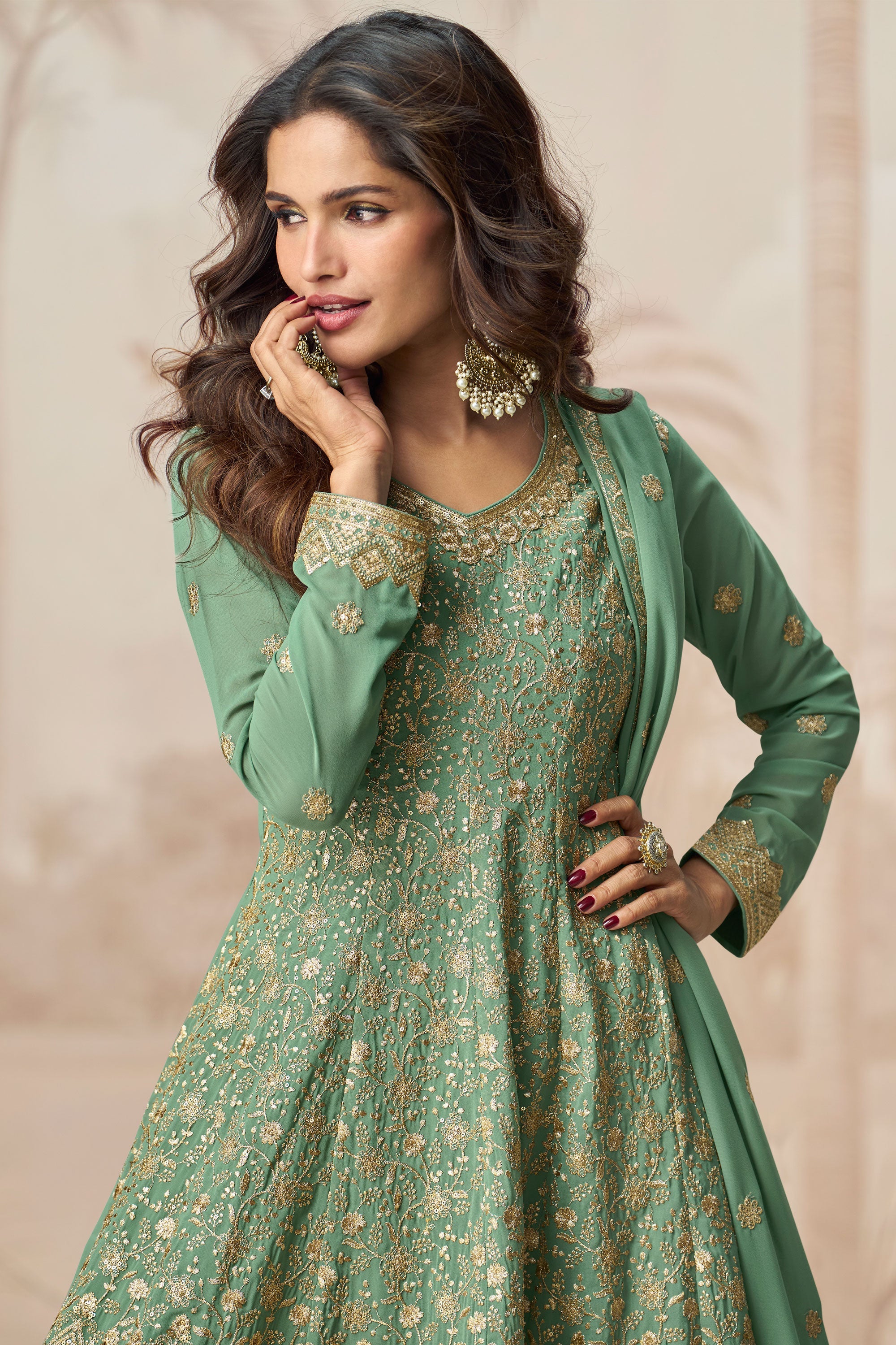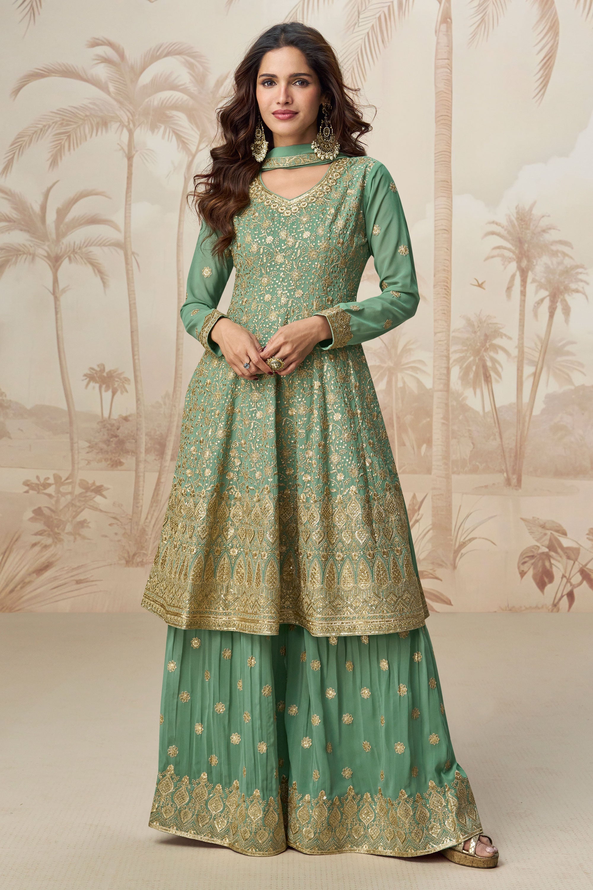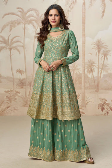Georgette Embroidered Sea Green Designer Palazzo Salwar Kameez