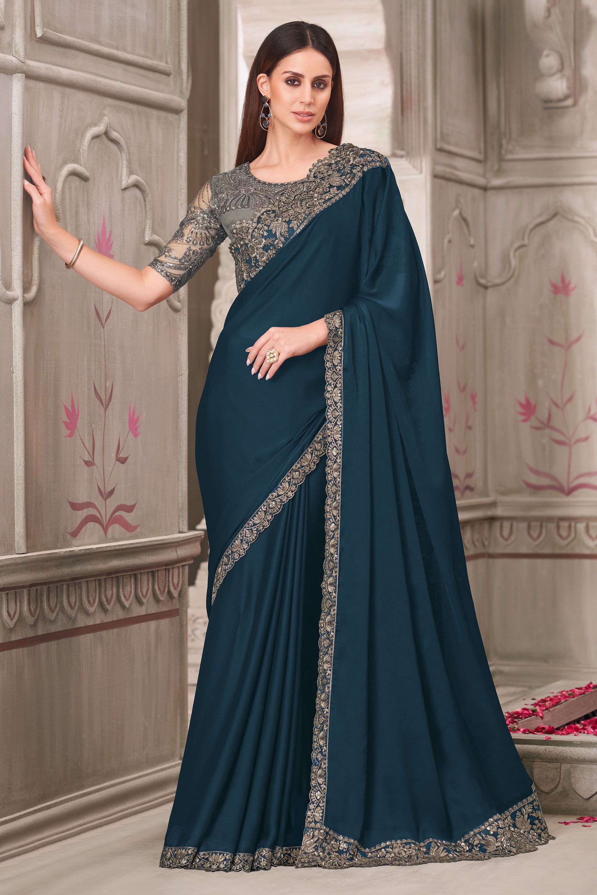 Teal Party Style Georgette Silk Charismatic Lace Border Work Saree With Embroidered Blouse