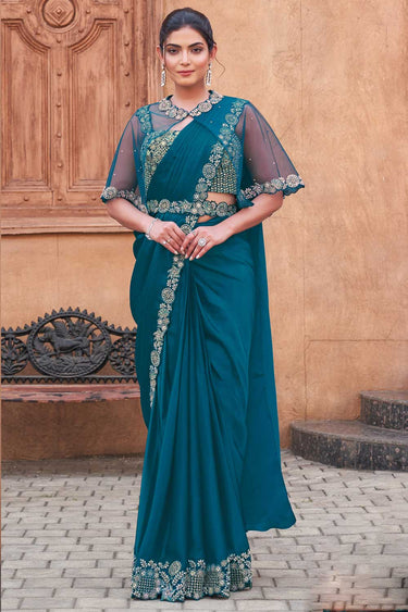 Teal Color Crepe Satin Silk Hand Work Ready to wear saree