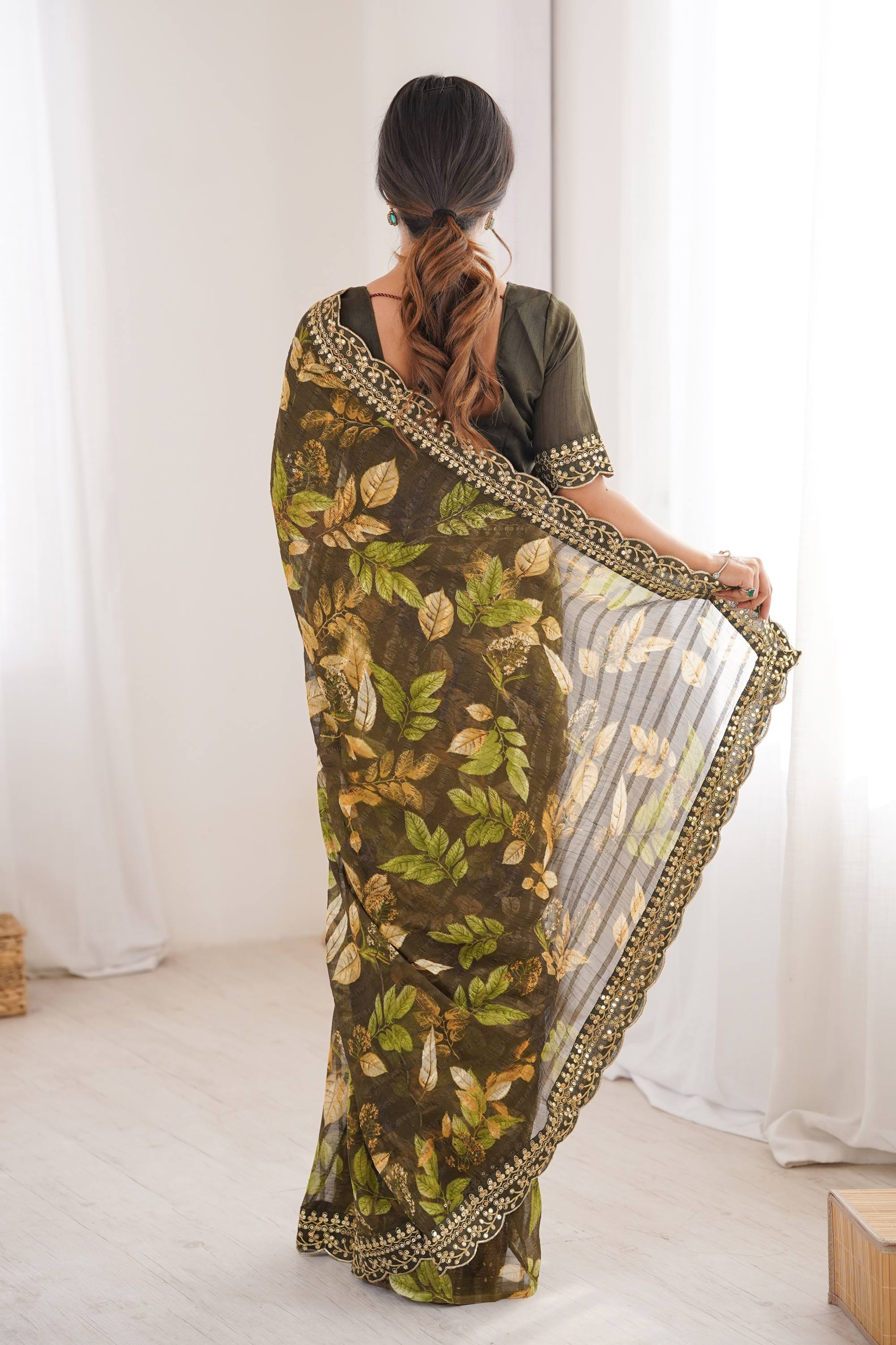 Olive Green Casual Wear Fancy Fabric Printed Saree