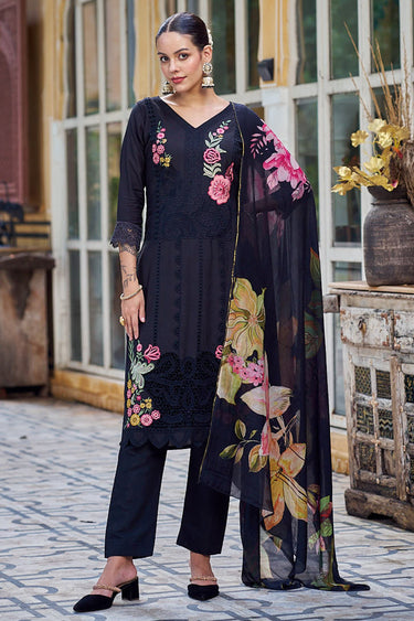 Enhance your festive wardrobe with this stunning Salwar Kameez set, designed for a stylish and comfortable fit. Crafted with exquisite floral contrast resham thread work, combined with intricate jari and cut work detailing. The top is made of luxurious muslin, measuring 2.30 meters, and is complemented by a bottom in pure silk, 2.50 meters in length. The muslin dupatta, spanning 2.20 meters, adds an elegant touch to the ensemble, while the pure cotton inner ensures utmost comfort, with a length of 1.60 meters. Tailorable for plus sizes up to 44, this set offers a versatile and fashionable choice for special occasions.