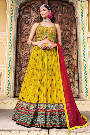 Reach Color Embellished Lehenga Set in premium heavy pure Chinon fabric, perfect for your special day. The Lehenga is a true masterpiece from our Bridal Collection, meticulously crafted for brides seeking elegance and sophistication. Available in sizes 38, 40, and 42. The Blouse is made from heavy pure Rasiion, offering a luxurious feel and impeccable fit. Complementing the set, the Dupatta is created from pure soft Georgette, providing an airy and delicate finish. Make a lasting impression with this exquisite lehenga choli that combines tradition with contemporary style.