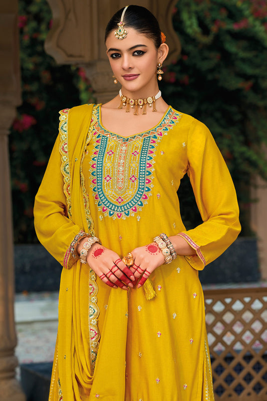 $114.00 AUD$228.00 AUD Original Price Save 50%/ Art Silk Mustard Embroidered Readymade Palazzo Salwar SuitSave 50%