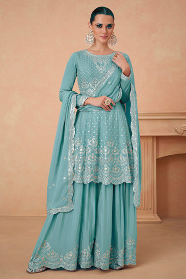 Eugeniya Belousova Tempting Chinon Fabric Cyan Color Readymade Palazzo Suit