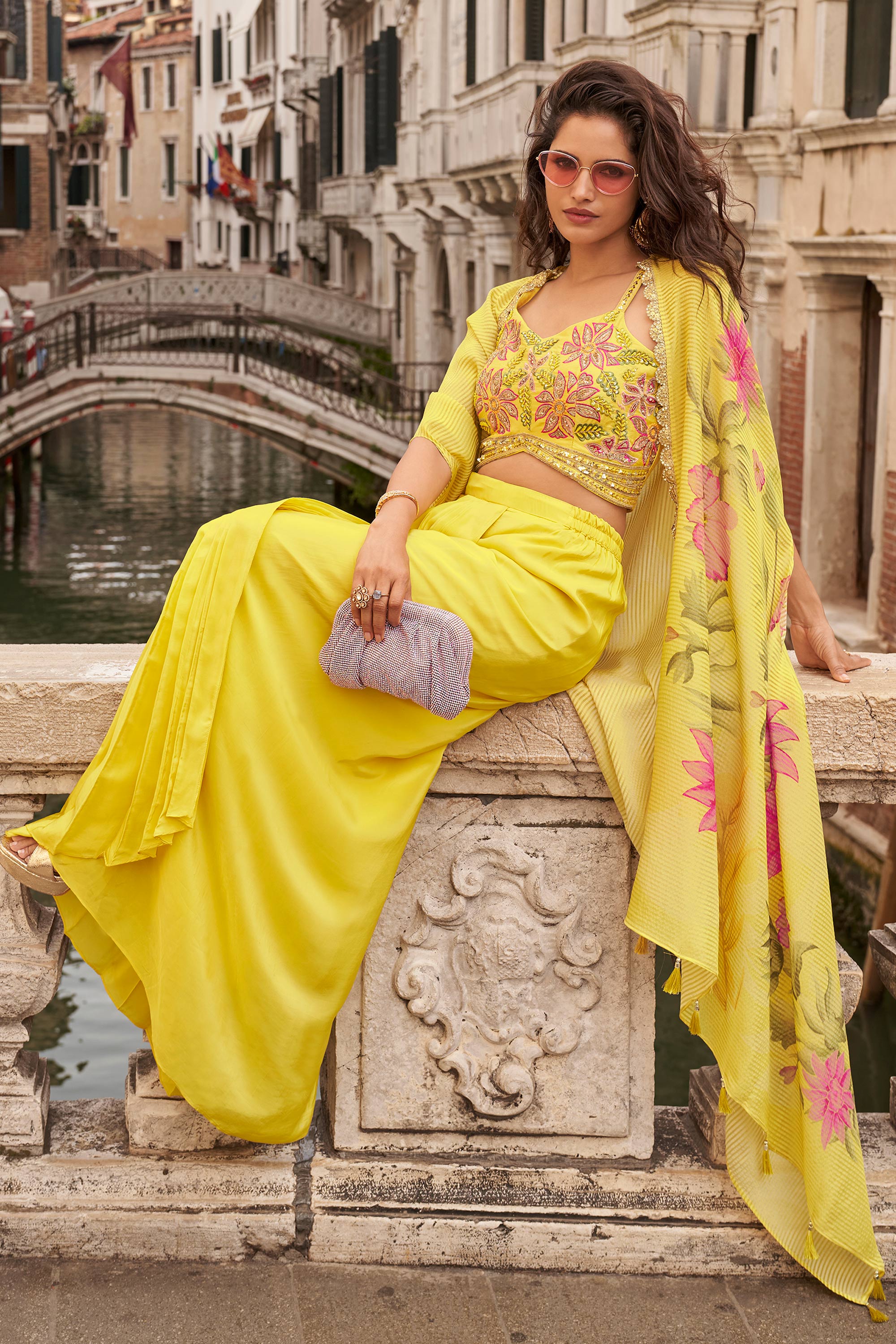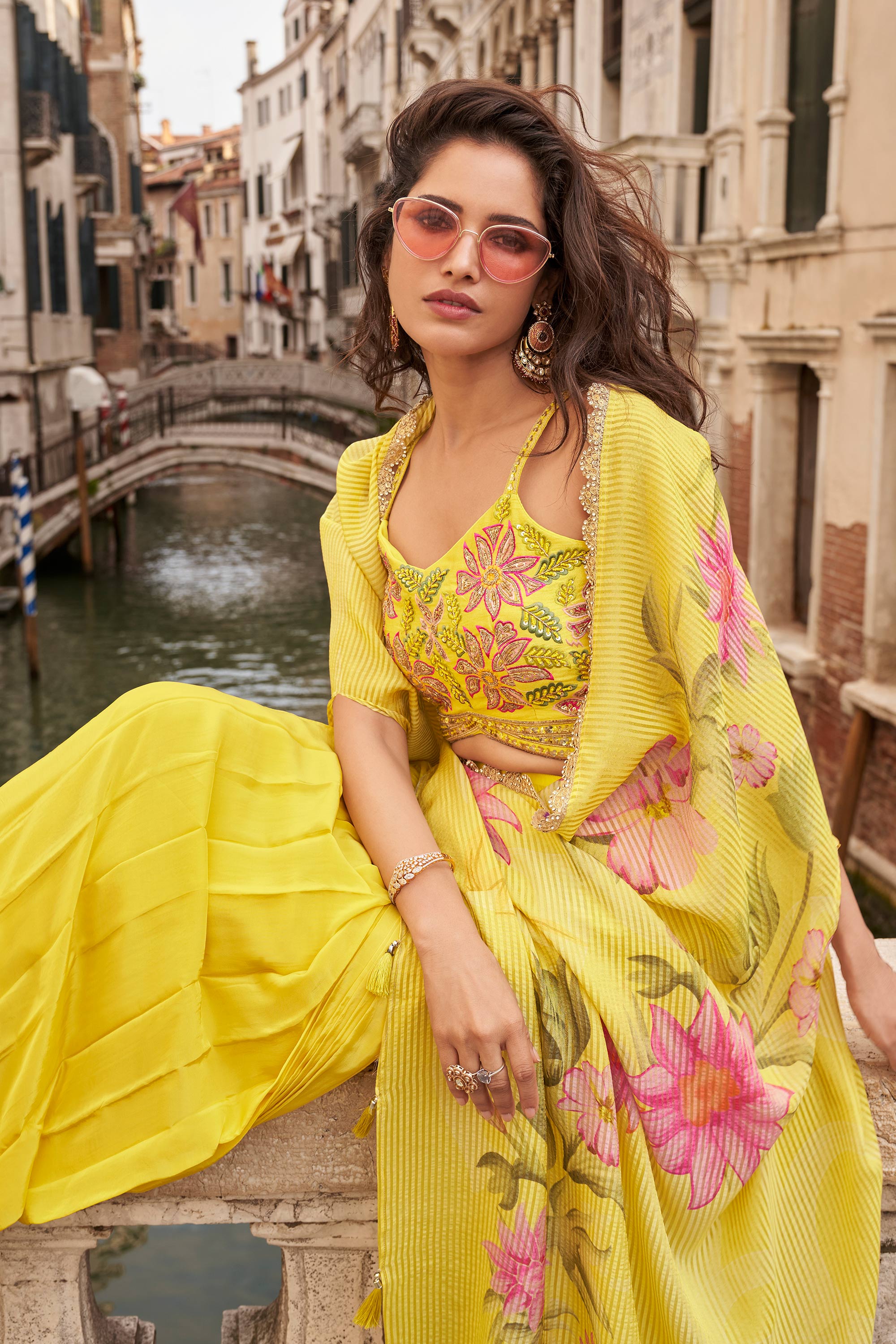 Yellow Party Wear Chinon Embroidered Readymade Palazzo Set With Designer Blouse And Shrug