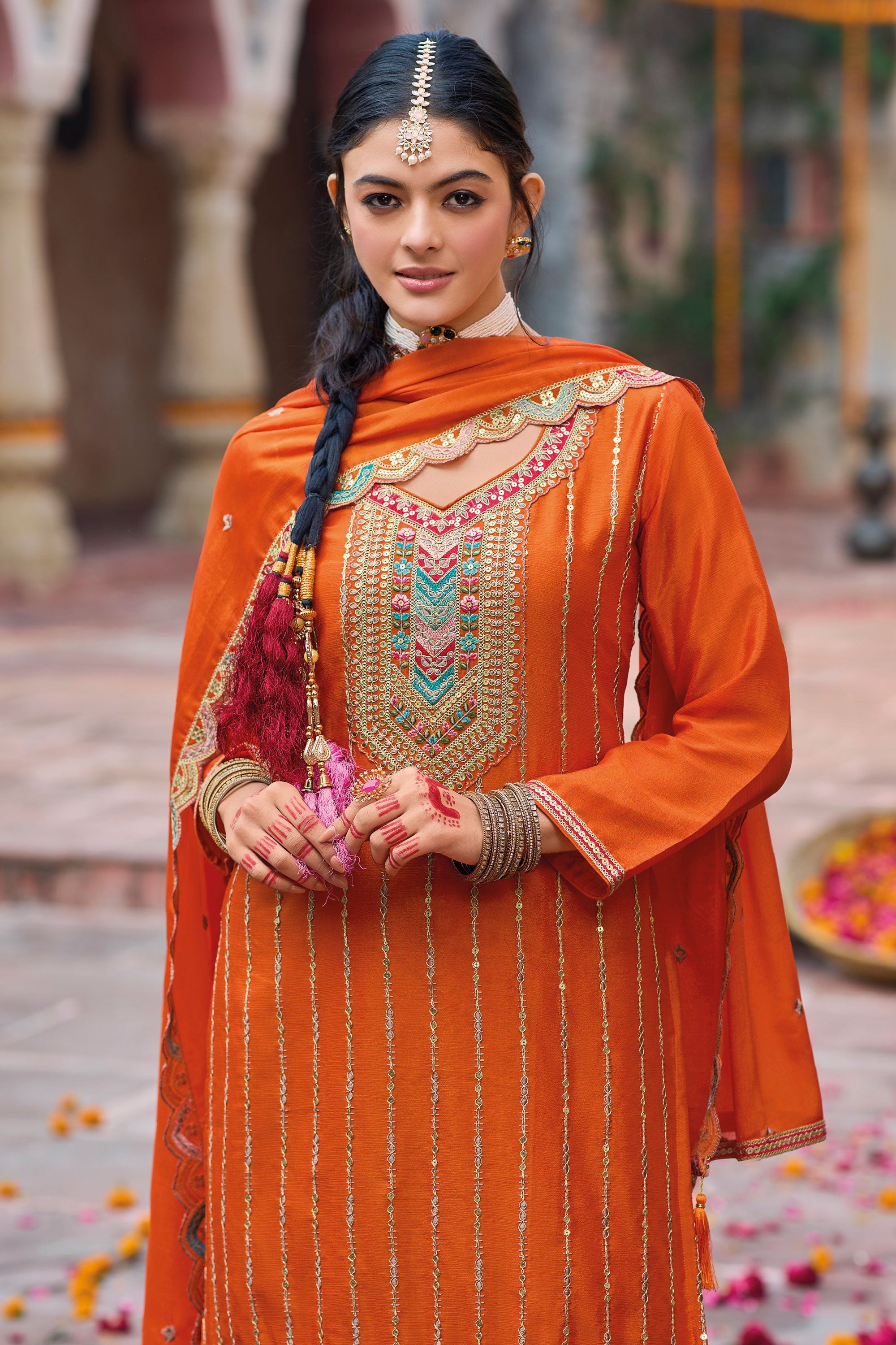 Attractive Orange Chinon Embroidered Punjabi Style Palazzo Suit