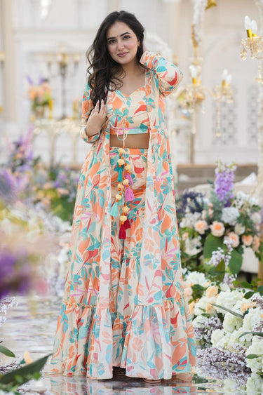 Get party-ready in an instant with this chic readymade Sharara suit. Made from lightweight Chinon fabric, this suit features a stylish printed koti, perfect for adding a touch of glamour to your party look.