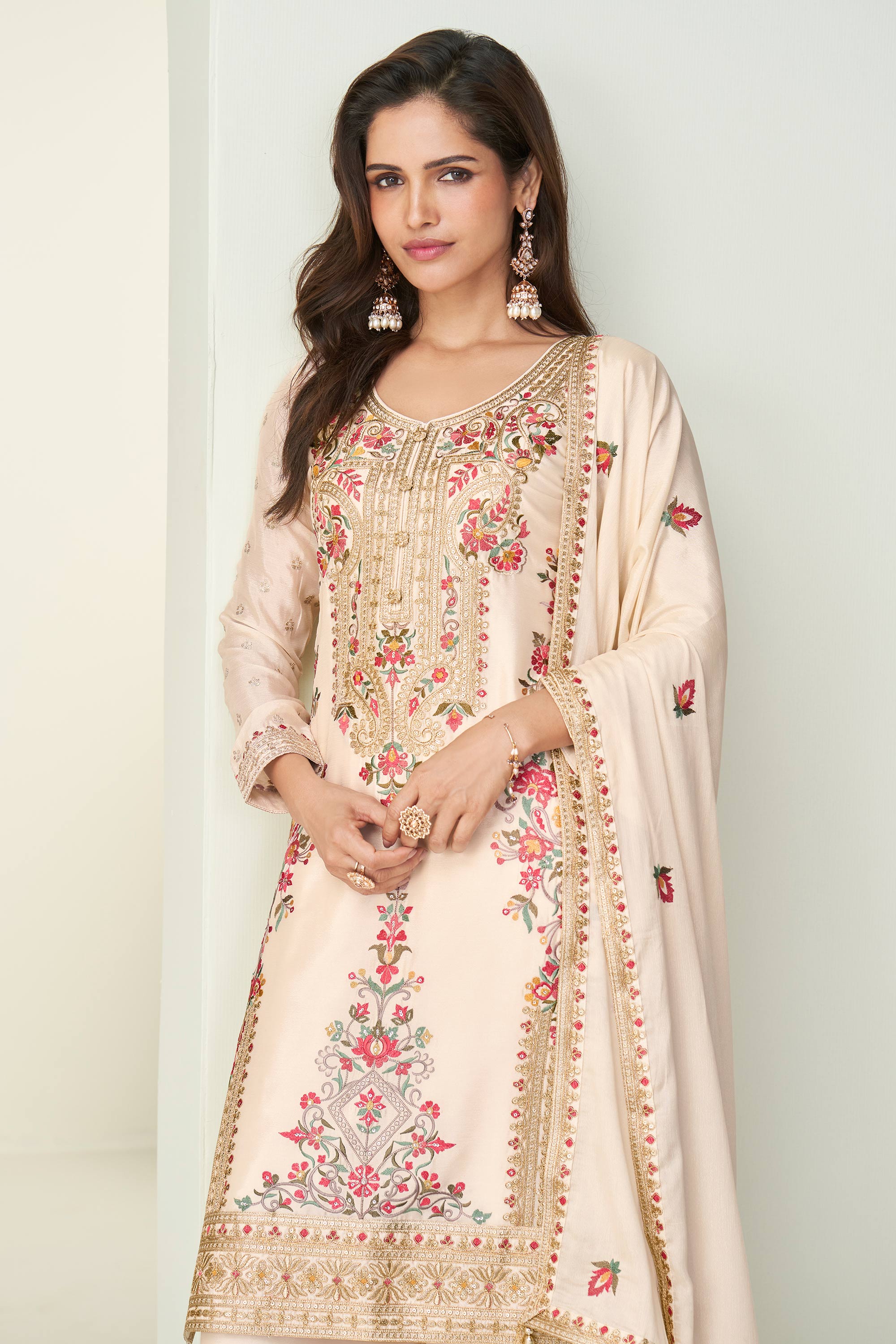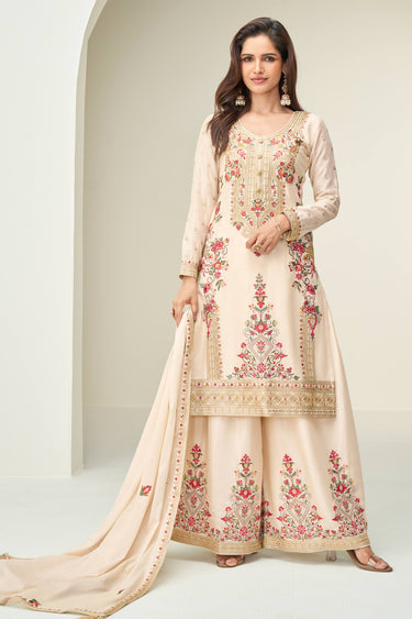 Chinon Silk Beige Embroidered Readymade Palazzo Salwar Suit