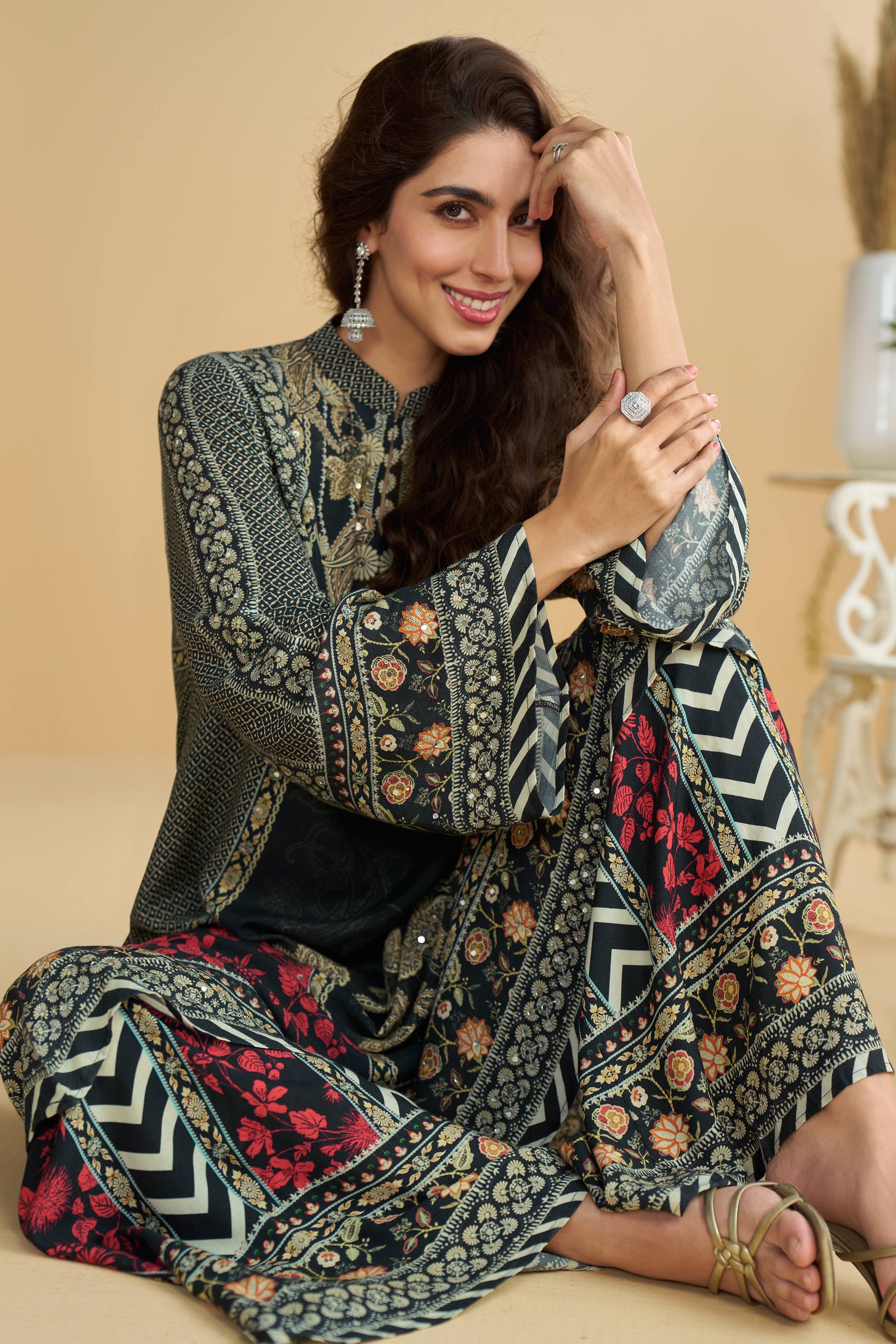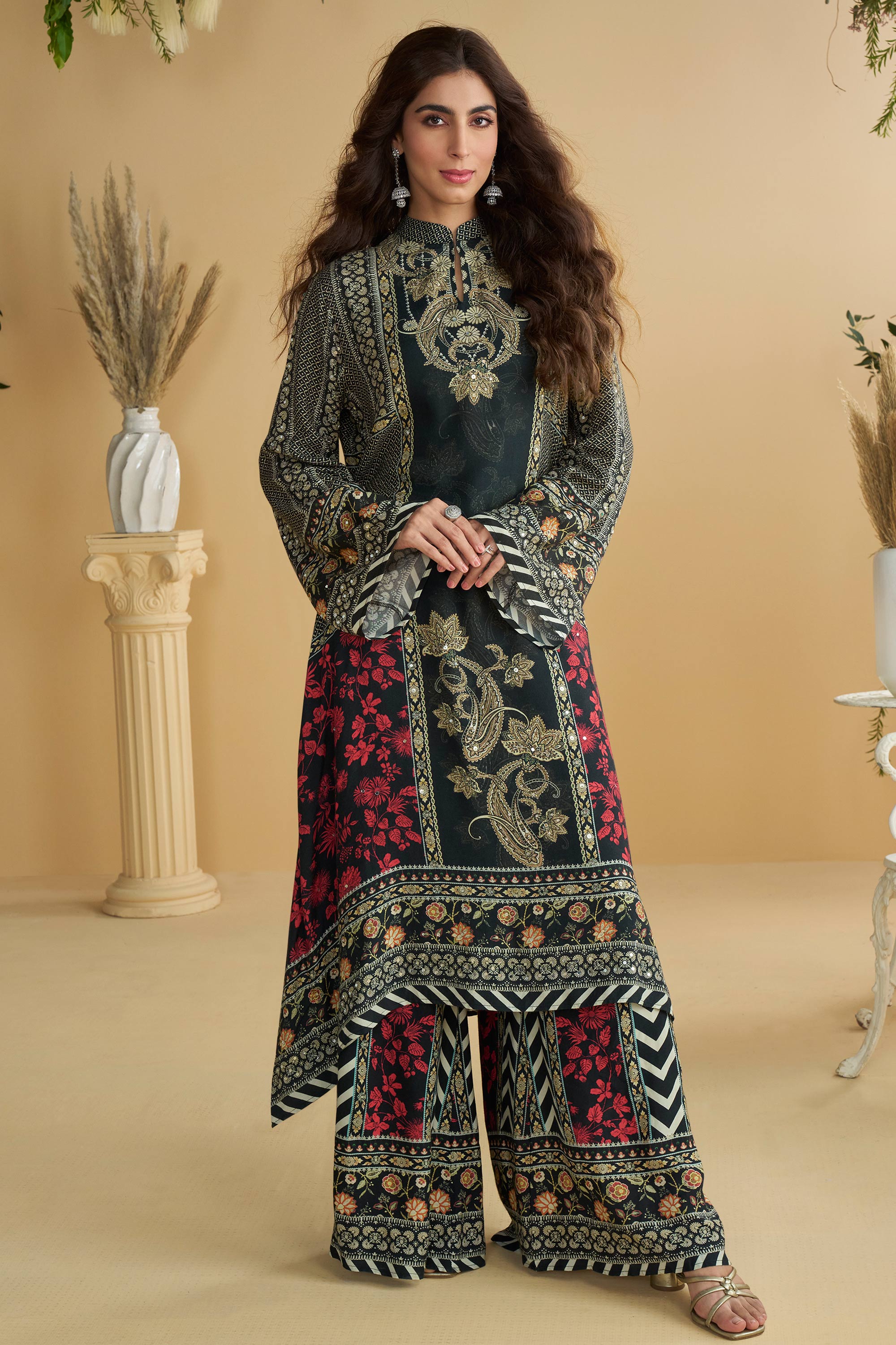 Crepe Silk Printed Black Readymade Palazzo Suit For Festive Wear