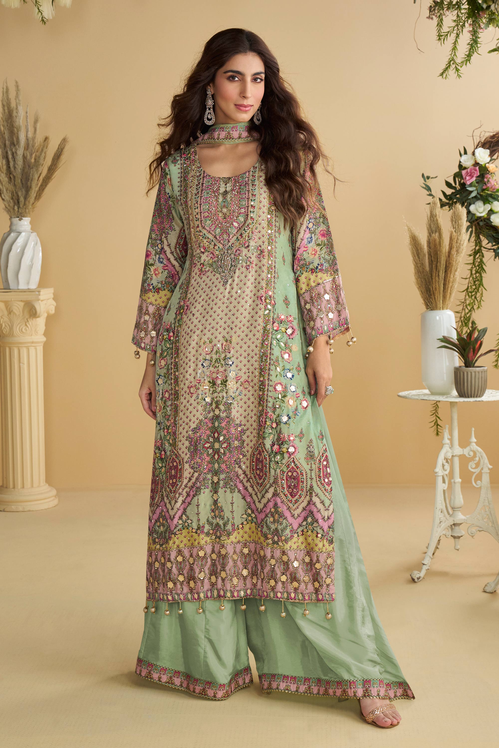 Crepe Silk Printed Sea Green Festive Wear Readymade Palazzo Suit