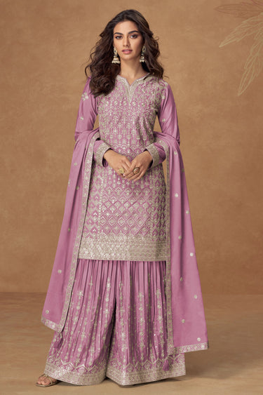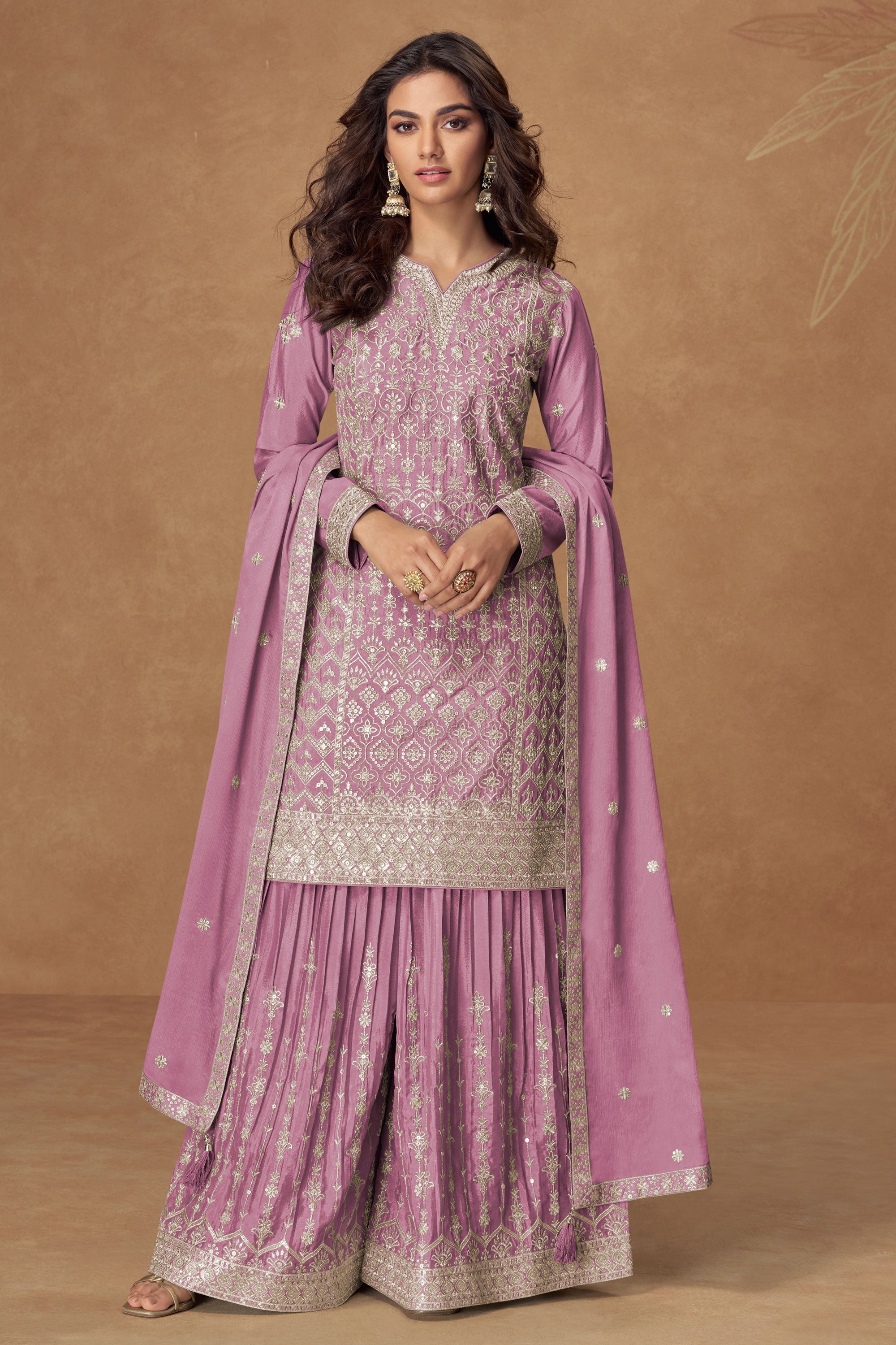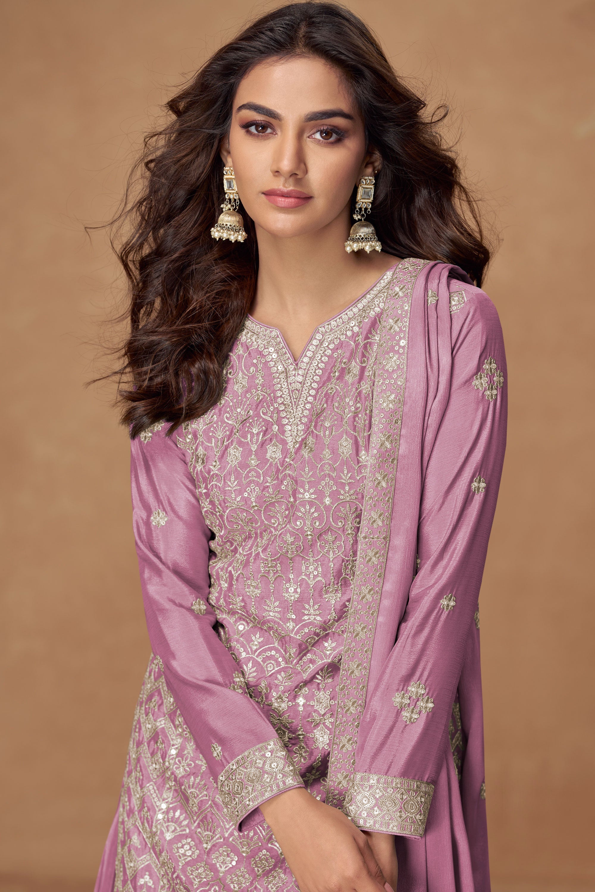 Embroidered Chinon Silk Pink Color Readymade Palazzo Suit