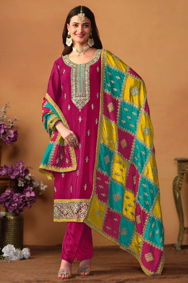 Fascinating Rani Color Chinon Silk Fabric Designer Suit With Multi Color Dupatta