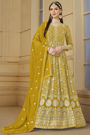 Function Wear Embroidered Georgette Fabric Anarkali Salwar Kameez In Yellow Color