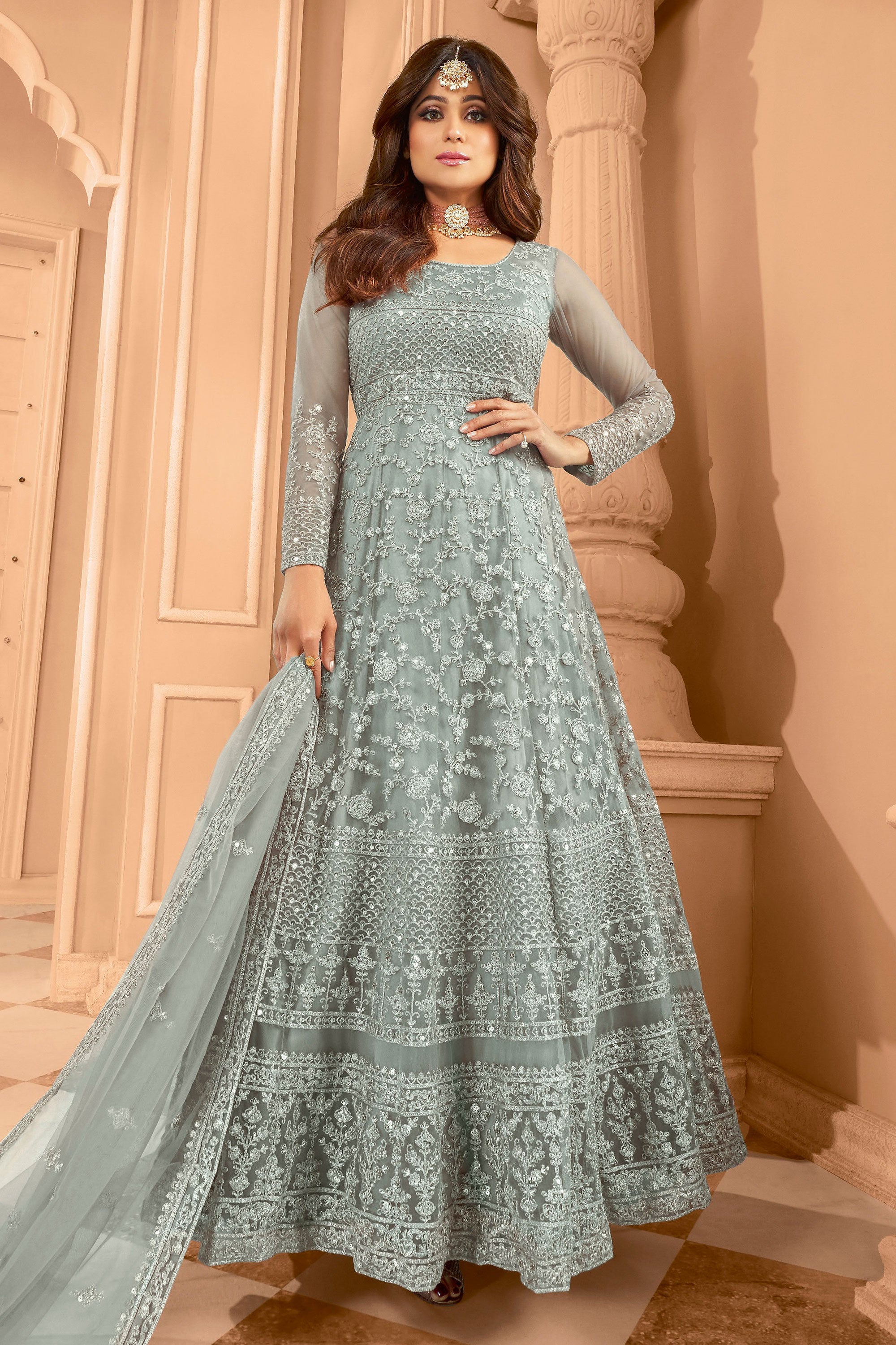 Shamita Shetty Grey Net Anarkali Suit With Dupatta
