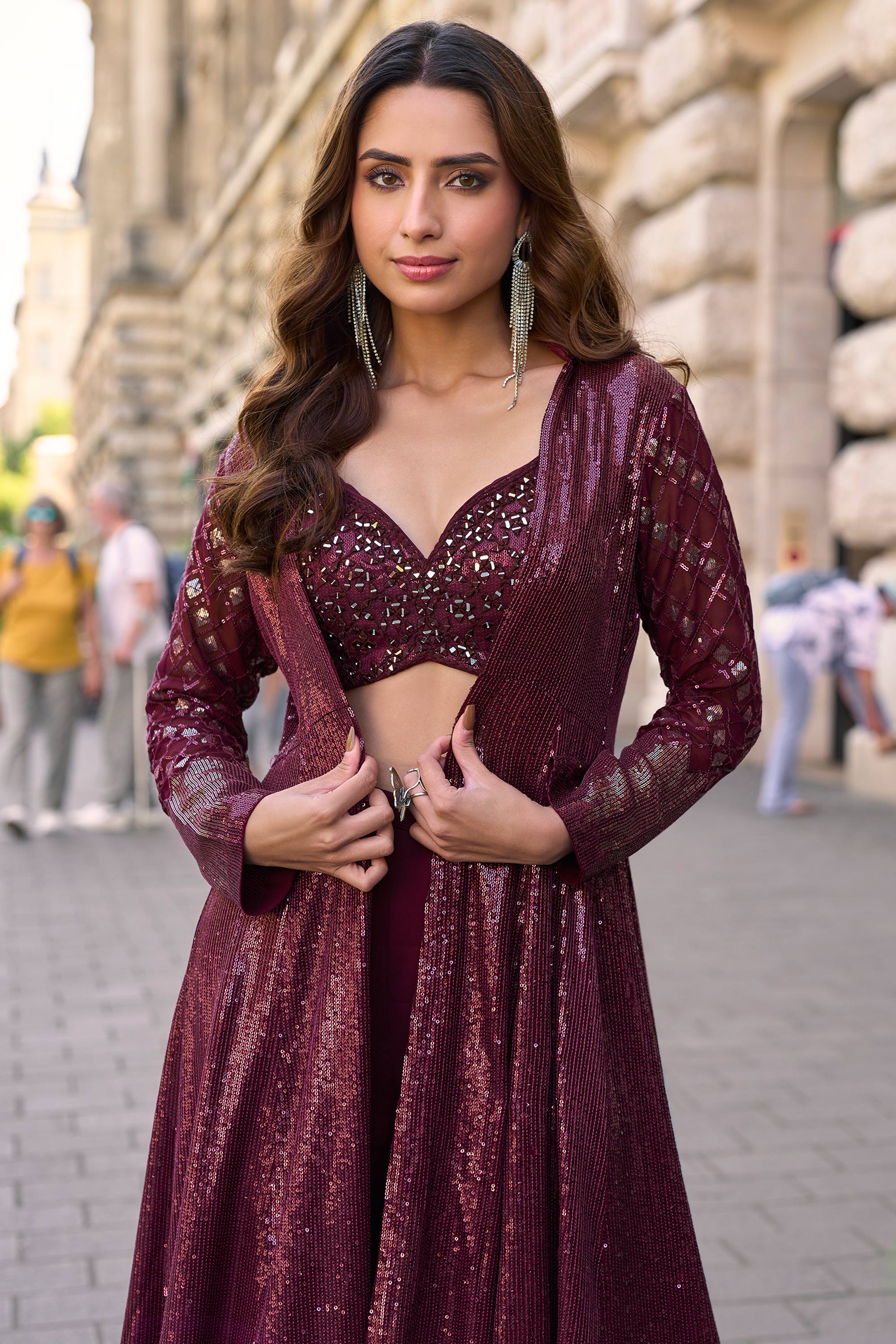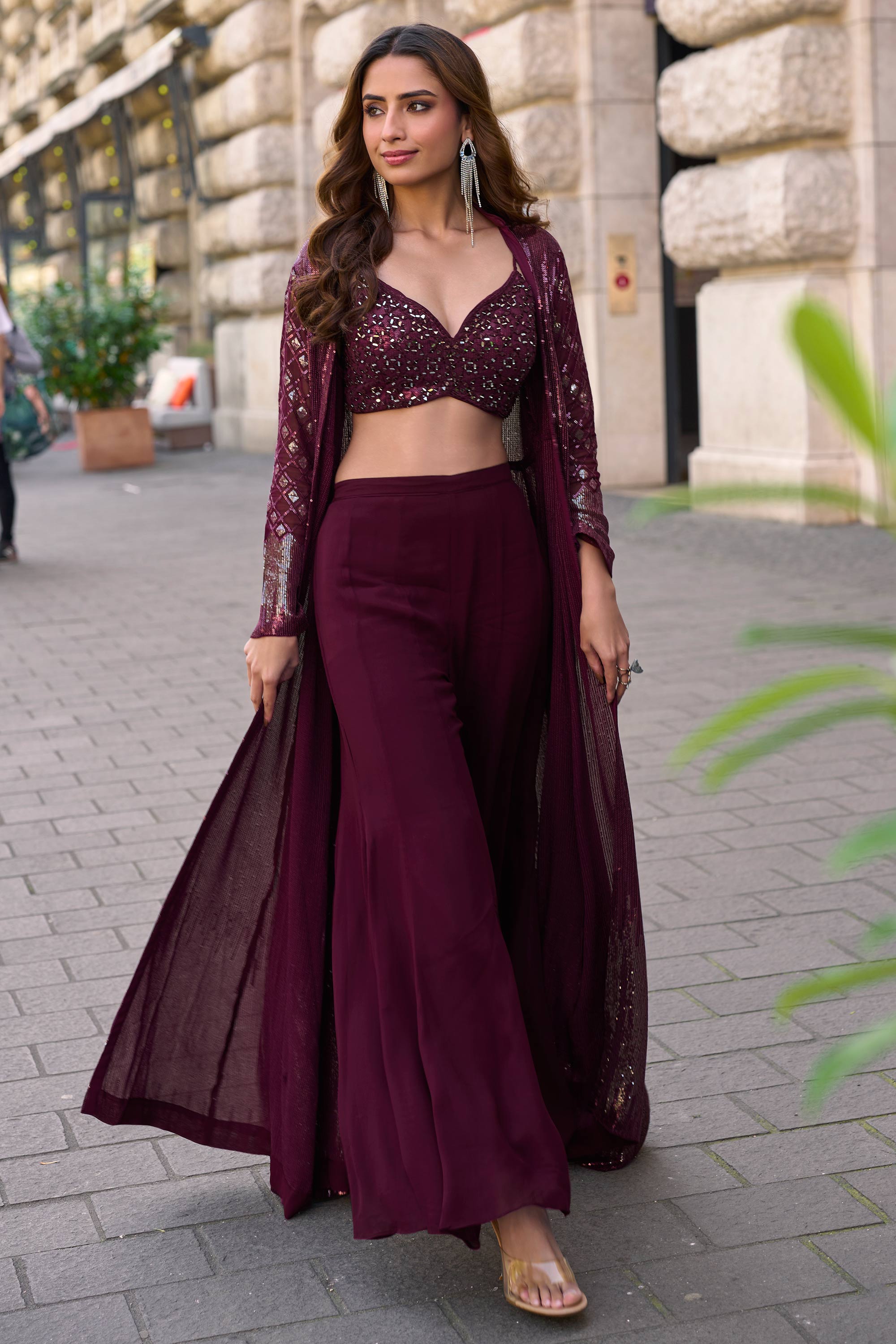 Wine Sequins Embroidered Western Look Outfit Blouse And Palazzo With Long Shrug