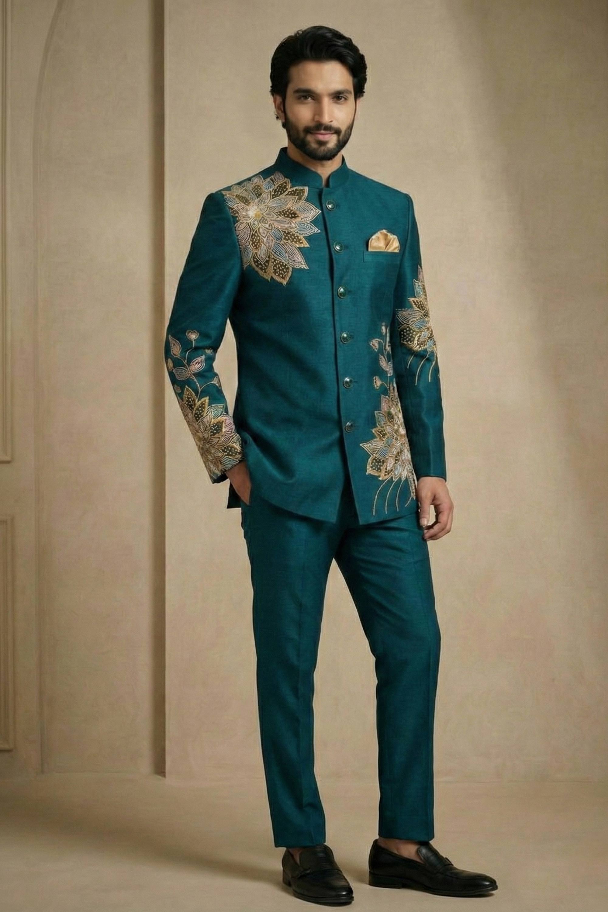 Embroidered Satin Silk Teal Sangeet Wear Readymade Jodhpuri Suit For Men