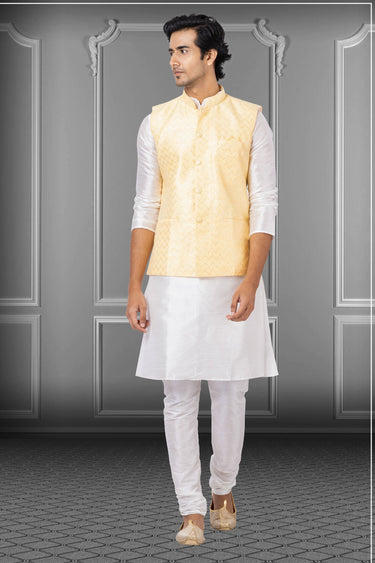 White Stunning Dhupion Raw Silk Fabric Function Wear Readymade Kurta Pyjama For Men With Jacket