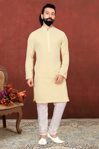 Yellow Georgette Fabric Sangeet Wear Trendy Readymade Kurta Pyjama For Men