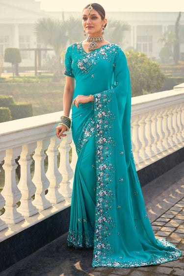 Blazing Cyan Color Embroidered Thread Work Crepe Saree
