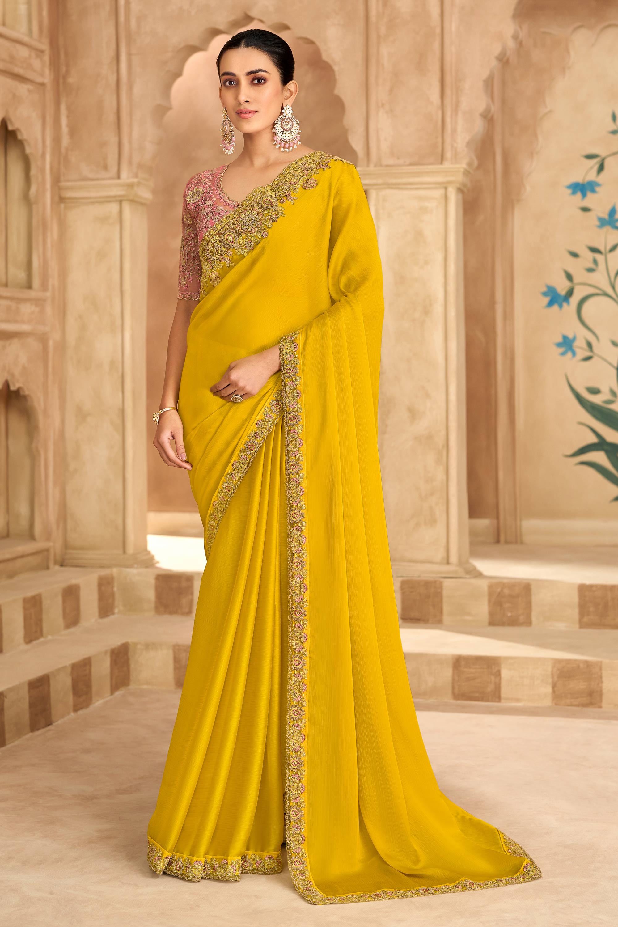 Chiffon Lace Border Work Yellow Festive Wear Designer Saree