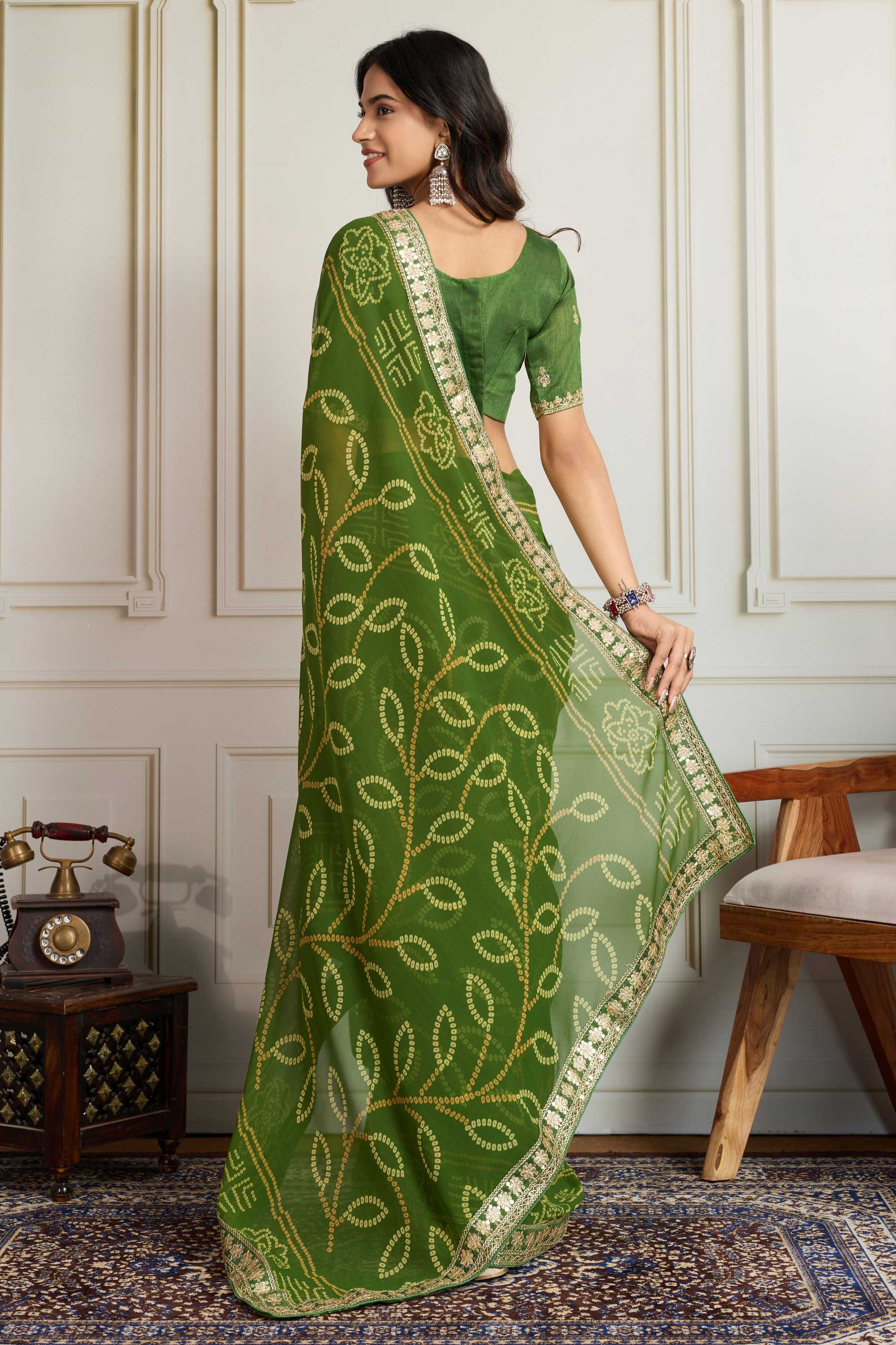 Function Wear Elegance Bandhani Print Saree In Green Color