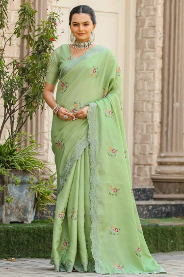 Green Color Embroidered Work On Cotton Fabric Chic Saree