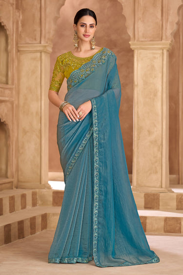 Lace Border Work Georgette Cyan Festive Wear Designer Saree