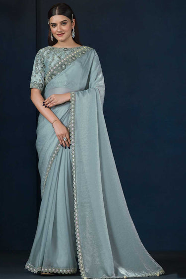 Light Cyan Two Tone Satin Silk Moti Pure Handwork Saree With Unstitched Blouse