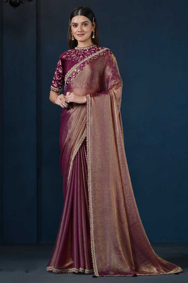 Magneta Crepe Satin Silk Jari Work Pure Handwork Saree With Unstitched Blouse