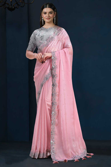 Pink Crepe Satin Silk Embroidered Stone Work Saree With Unstitched Blouse