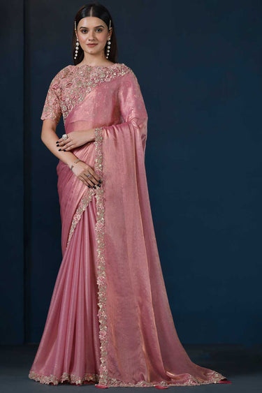 Pink Simmer Chiffon Sequins Pure Handwork Saree With Unstitched Blouse