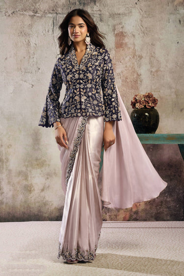Satin Embroidered Border Work Lavender Readymade Saree For Function Wear