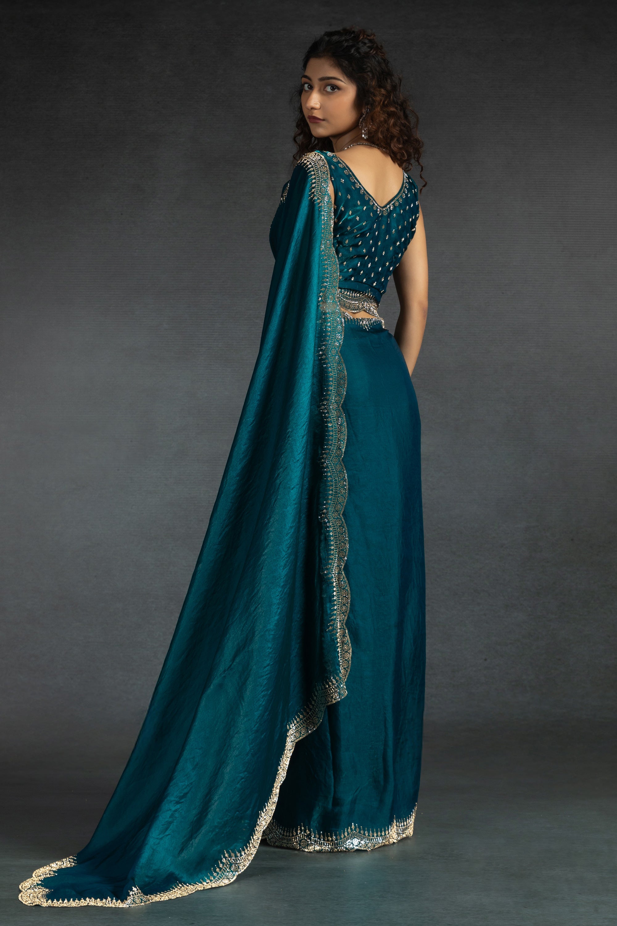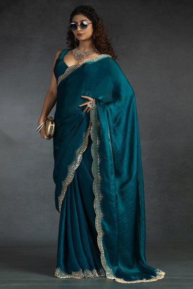 Teal Satin Silk Stone Border Work Saree For Party Wear