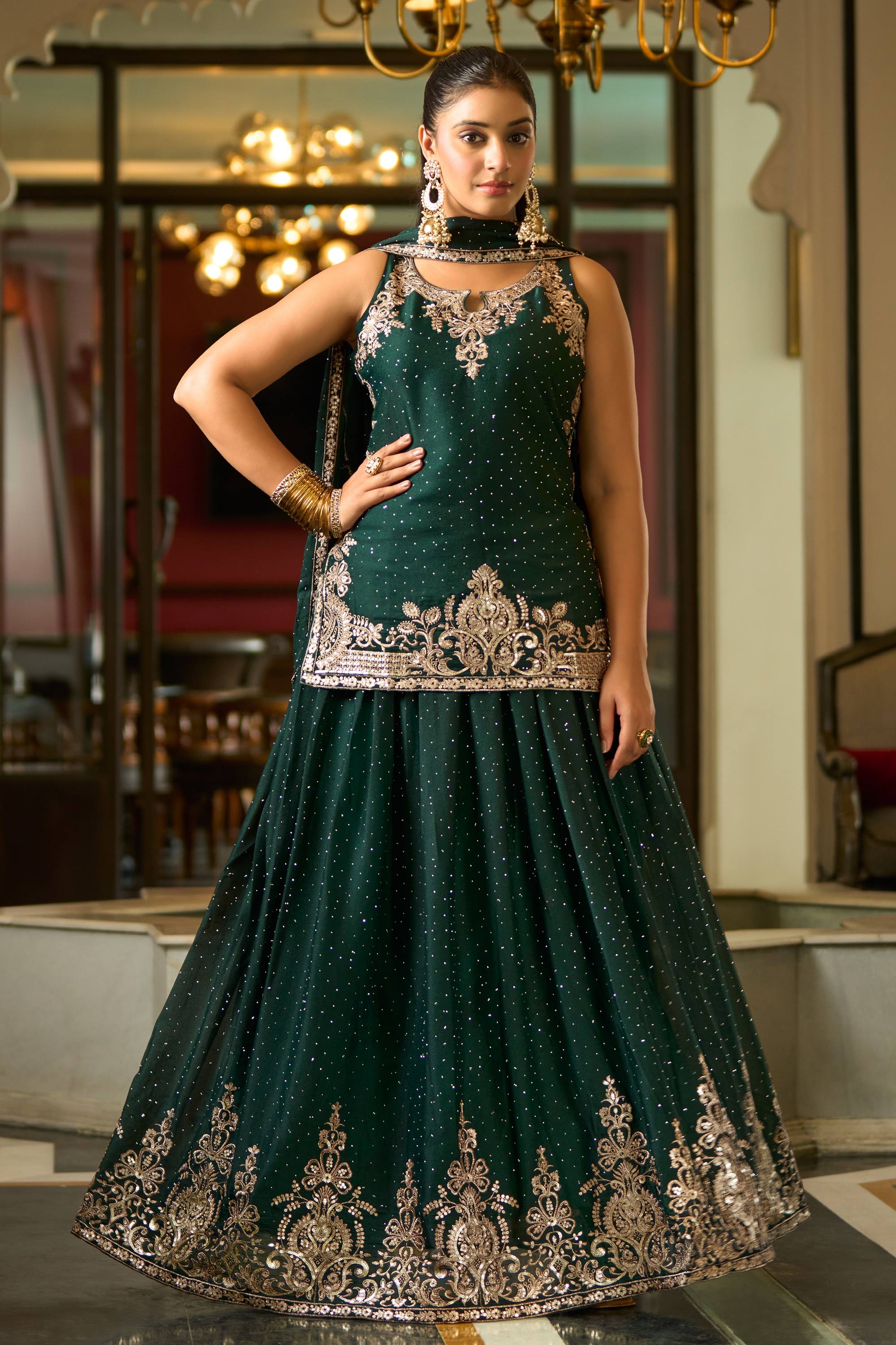 Georgette Silk Fabric Dark Green Readymade Sharara Style Lehenga For Party Wear