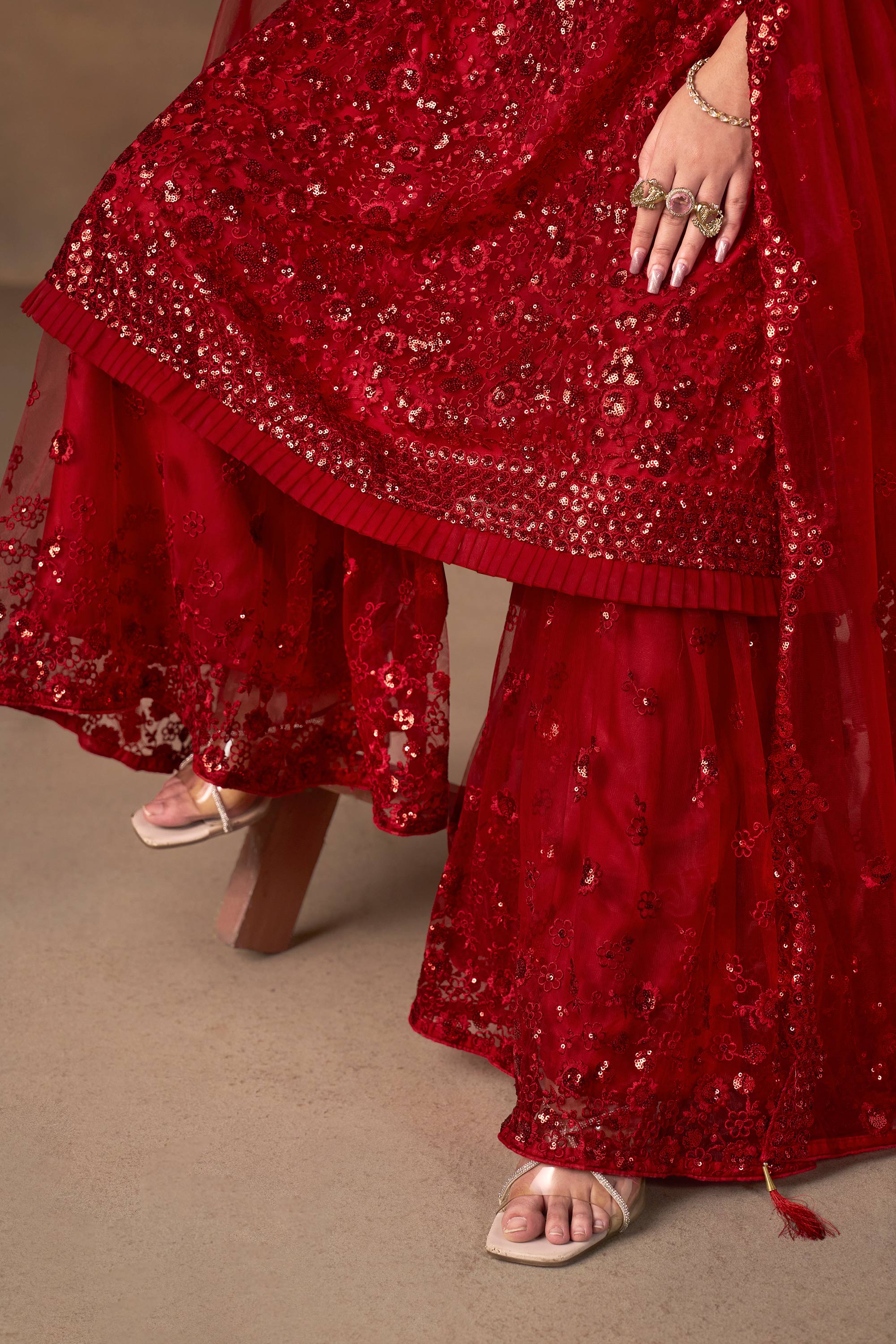 Net Sequins Embroidered Red Festive Wear Palazzo Suit With Dupatta