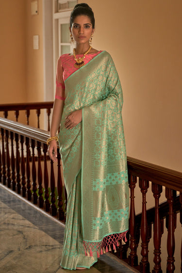 Appealing Weaving Work On Crepe Silk Fabric Saree In Sea Green Color