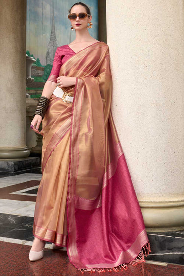 Weaving Work On Captivating Tissue Silk Fabric Saree In Peach Color