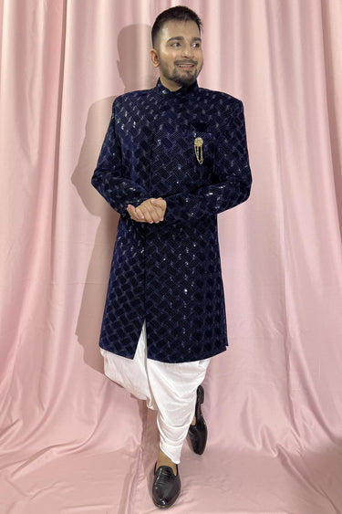 Blue Color Velvet Fabric Heavy Embroidered Wedding Wear Designer Readymade Indo Western For Men
