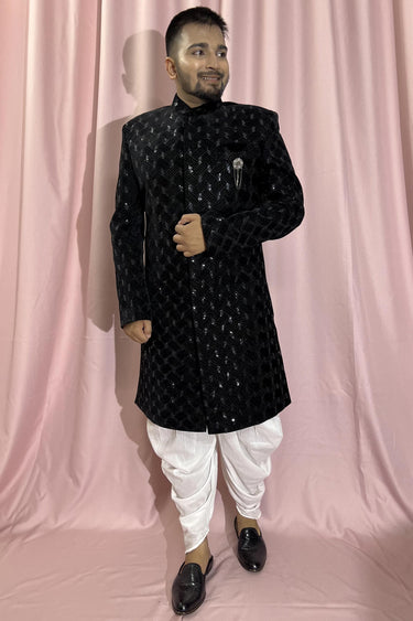 Velvet Black Magnificent Readymade Men Indo Western For Wedding Wear