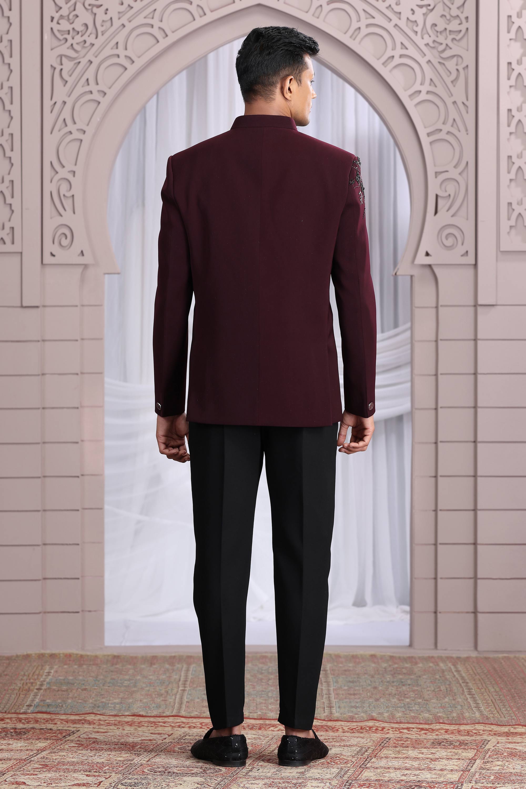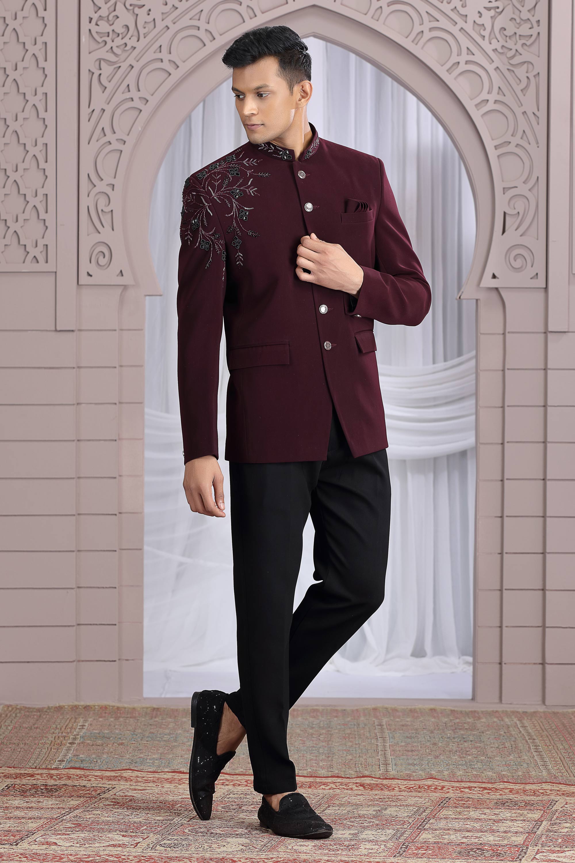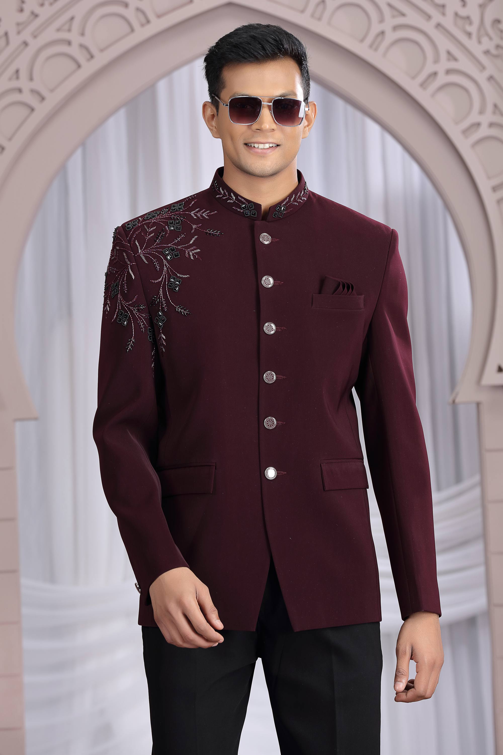 Fancy Fabric Wine Wedding Wear Readymade Designer Men Indo Western Jodhpuri Suit